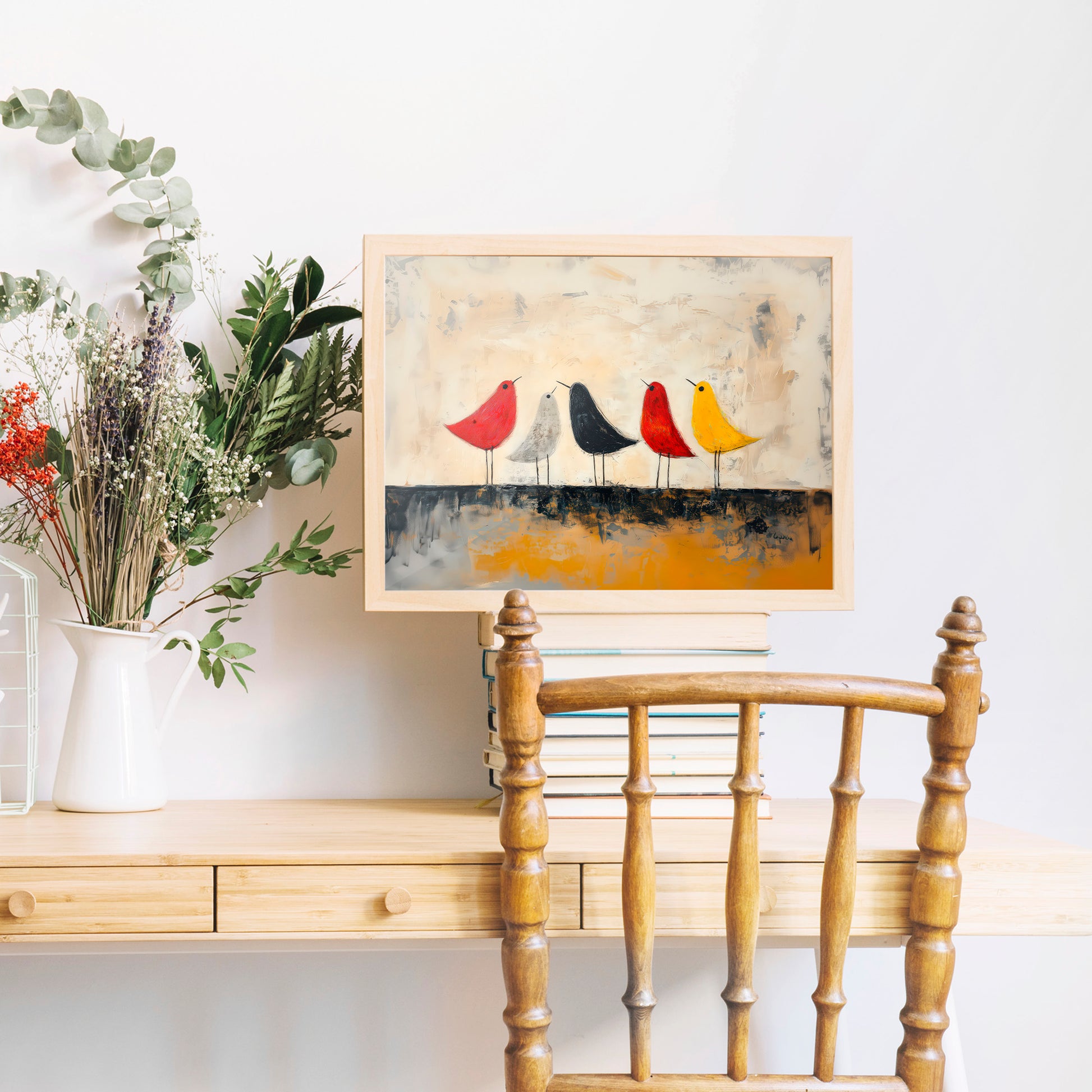 A lively and modern abstract illustration featuring five stylized birds in bold, contrasting colors—red, gray, black, red, and yellow—standing together on a textured surface. The background blends warm neutral tones with expressive brushstrokes, creating a contemporary artistic feel. The minimalist bird shapes, elongated legs, and soft gradients give the artwork a playful yet sophisticated character. Perfect for modern home décor, nursery wall art, studio accents, or creative digital design use, this piece brings charm, color, and personality to any space.