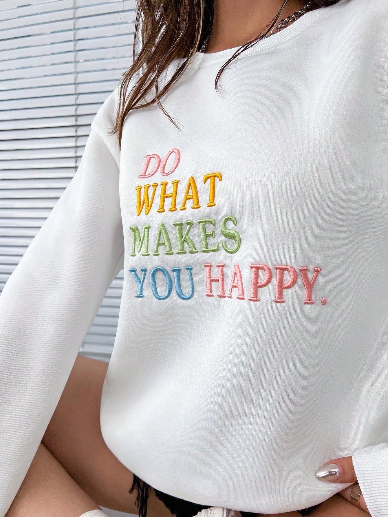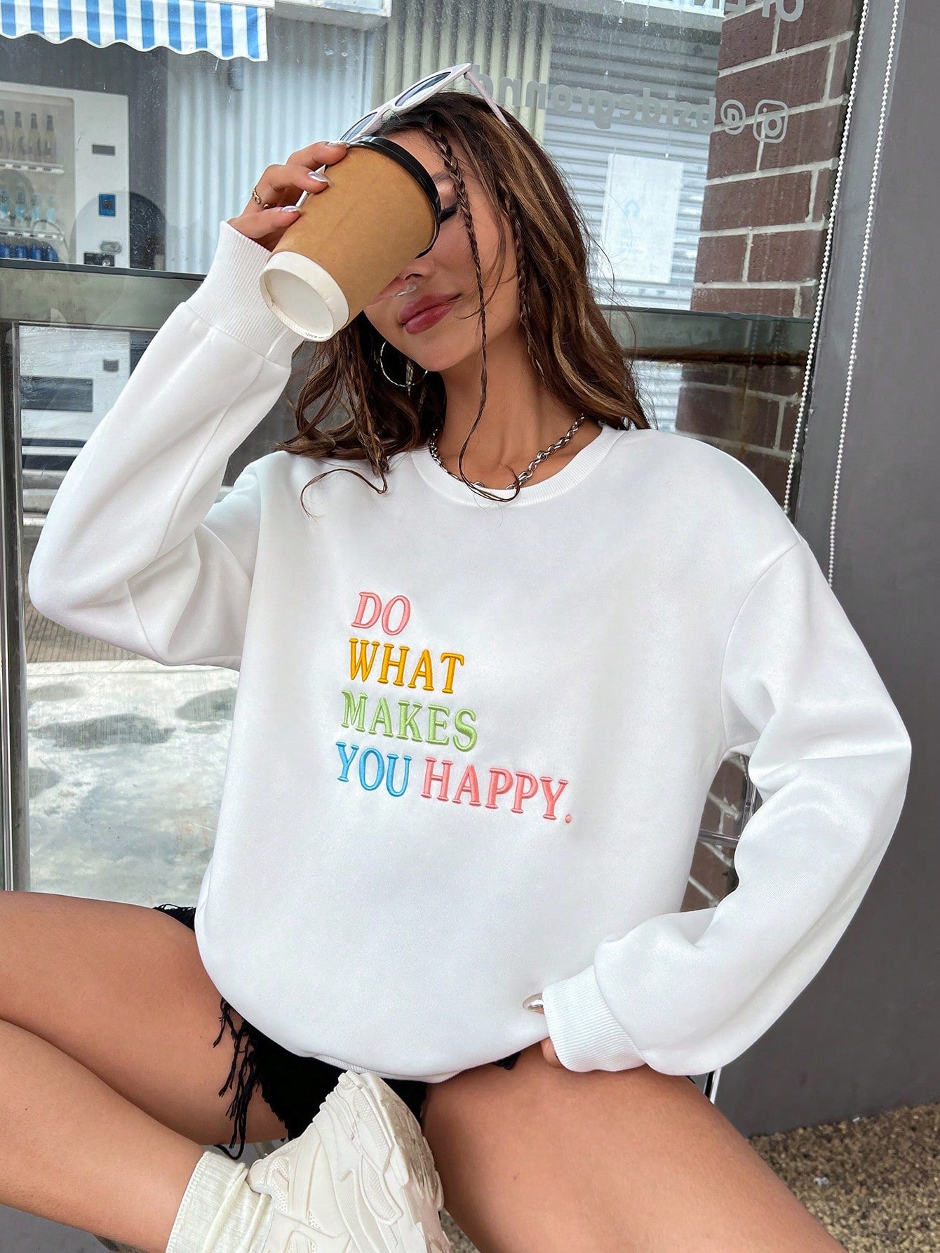 Introducing our Cozy and Cute: Slogan Embroidery Drop Shoulder Sweatshirt. Made with the softest materials, this sweatshirt is designed for ultimate comfort and style. The embroidered slogan adds a touch of personality to any outfit. Stay warm and fashionable in our Cozy and Cute sweatshirt.
