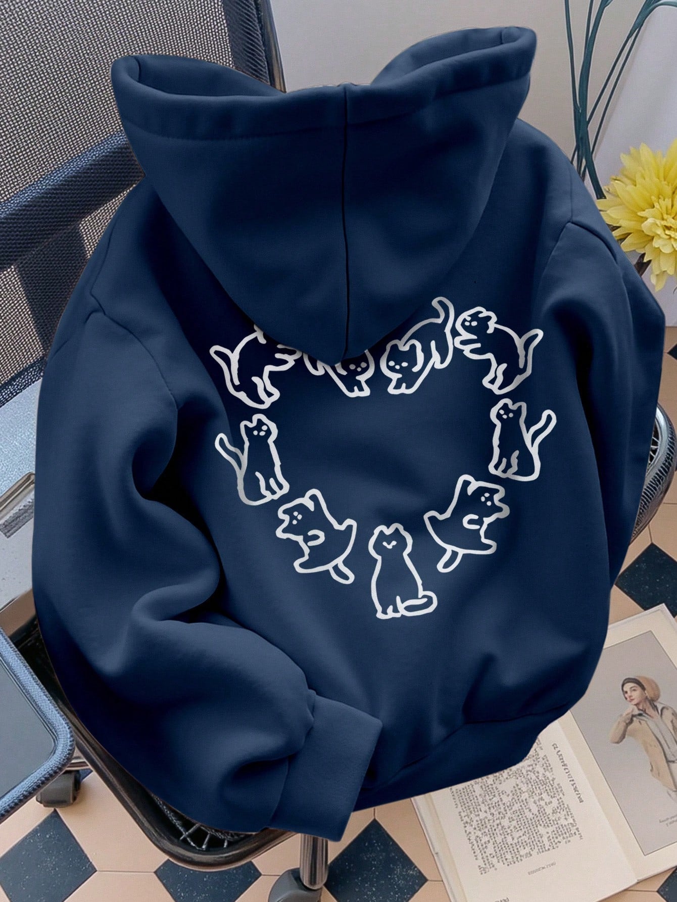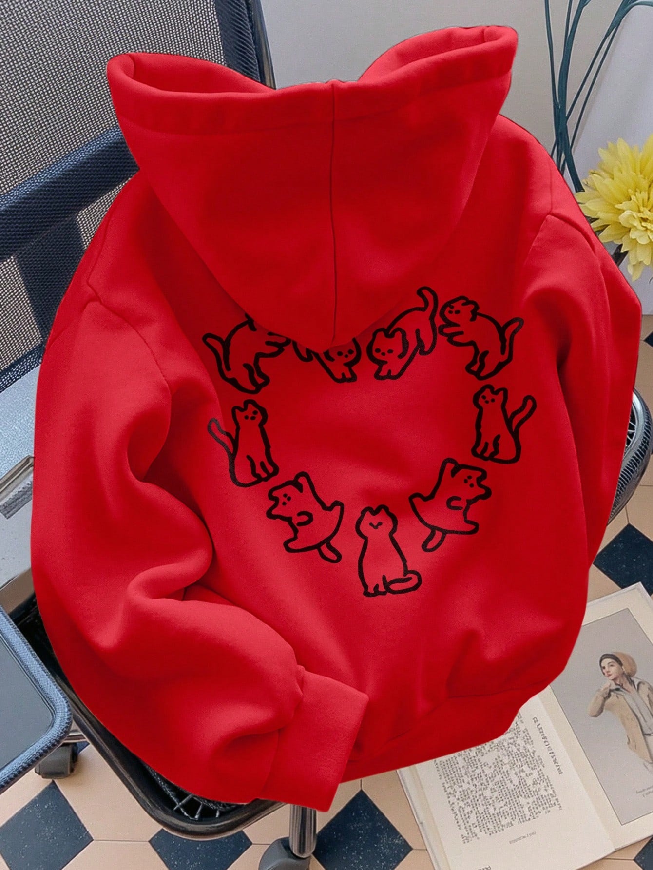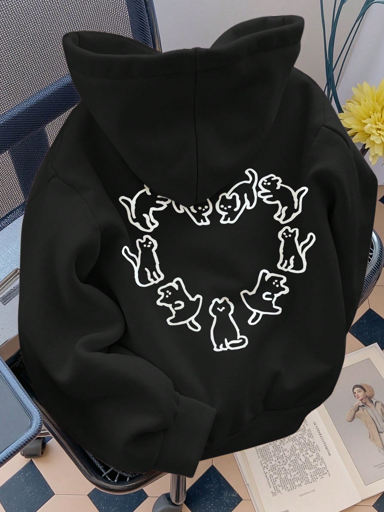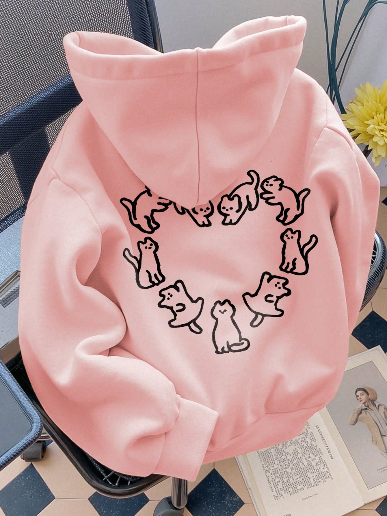 Cozy Cat Love: Heart Print Casual Hoodie for Autumn & Winter