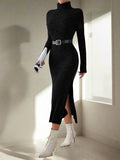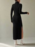 Cozy Chic Turtleneck Split Thigh Dress with Sleeves for Effortless Elegance