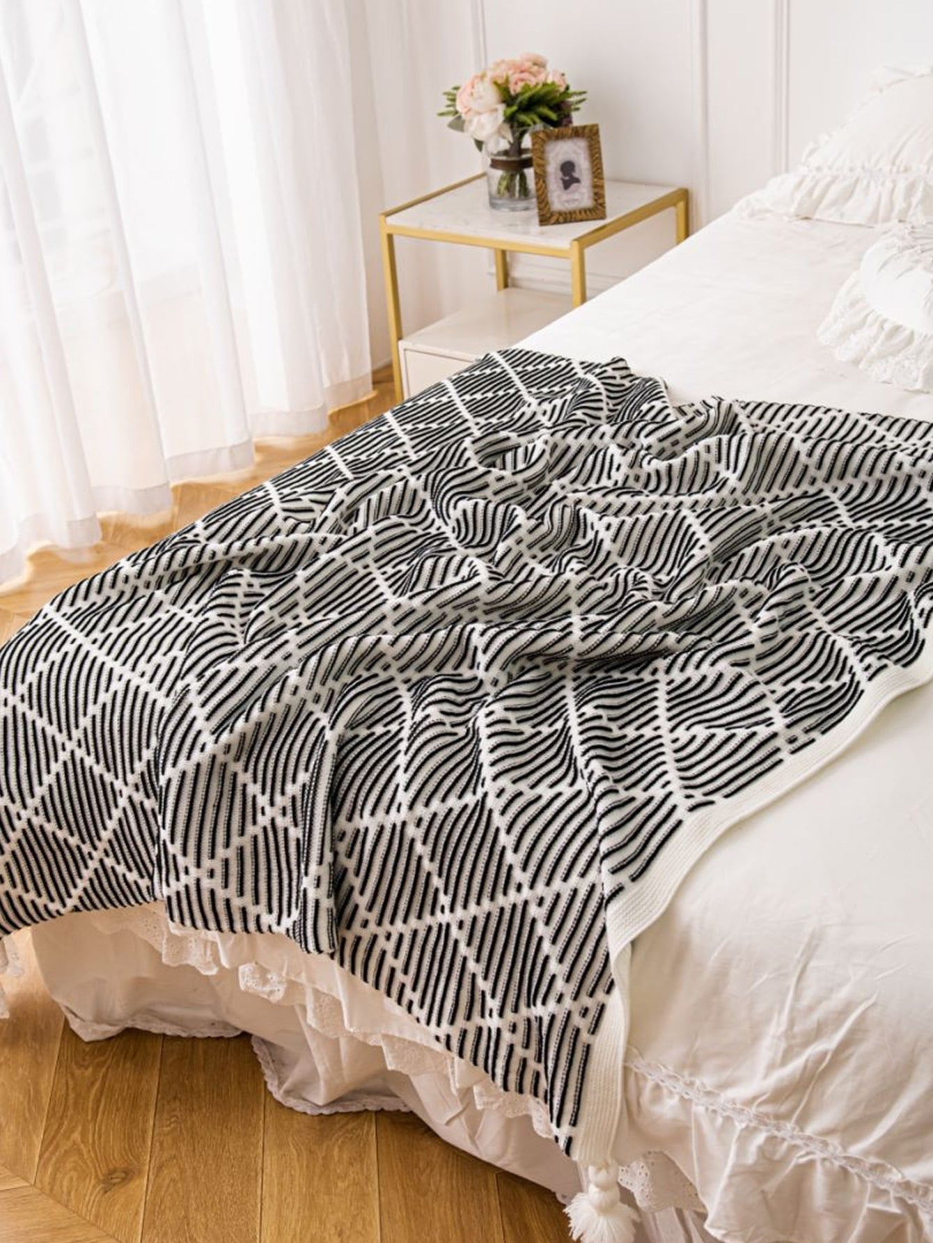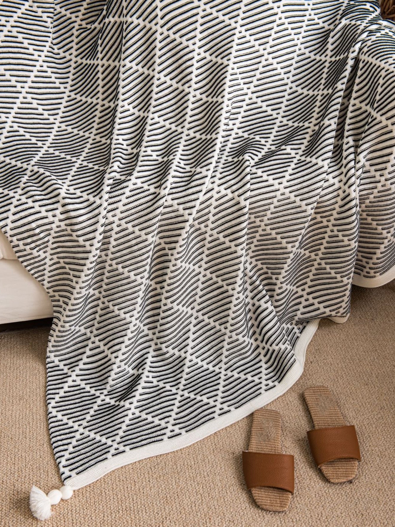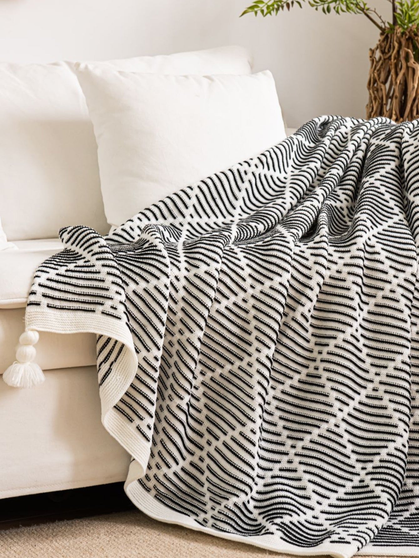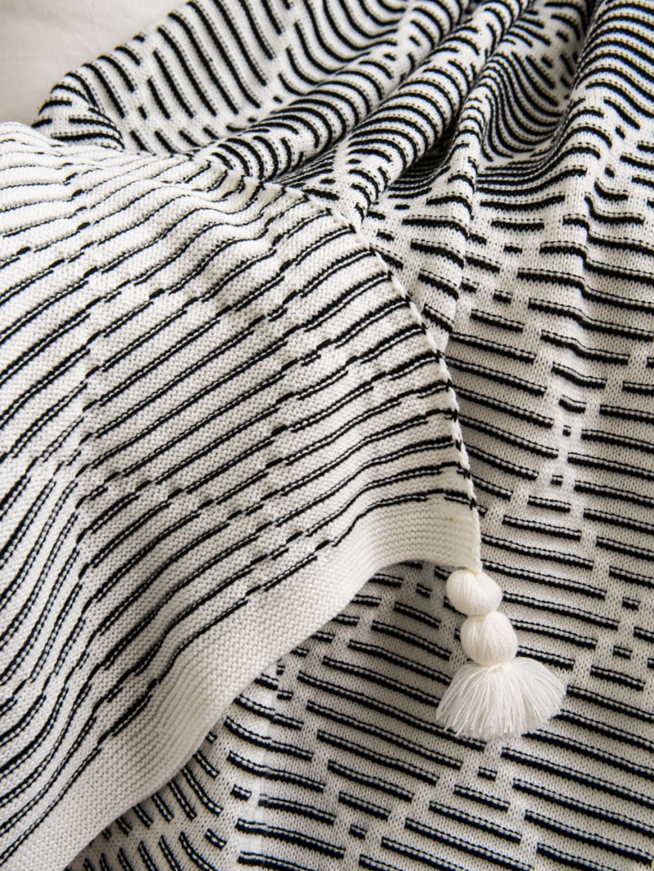 blanket. Made from Nordic fabric, it features a striped geometric pattern and tassel decoration, both adding a touch of elegance to your couch or bed. Stay warm and stylish with this must-have accessory."