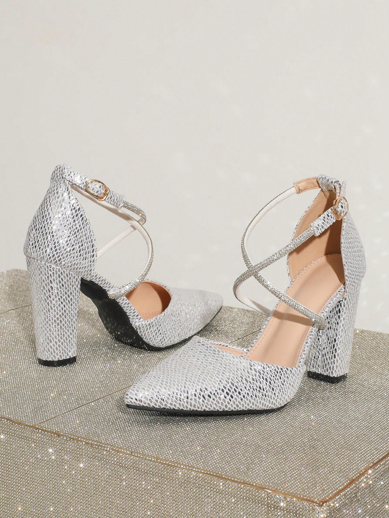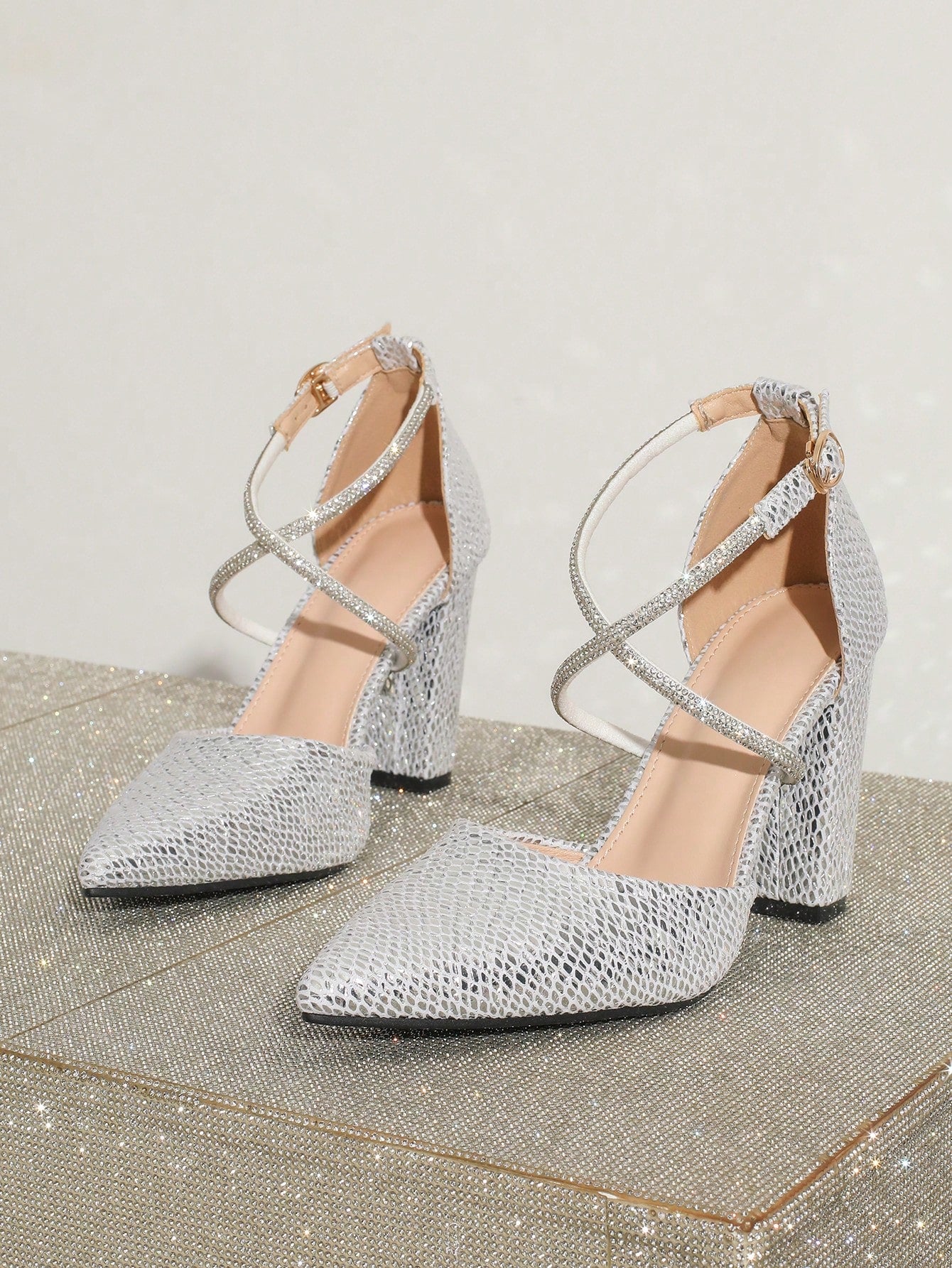 Elevate your style with these Crystal Cross Strap High Heel Party Shoes: Women's Elegant Fashion Statement. Crafted with sparkling crystals and a cross strap design, these heels make a bold fashion statement. Perfect for parties or special occasions, these shoes are both elegant and eye-catching.
