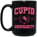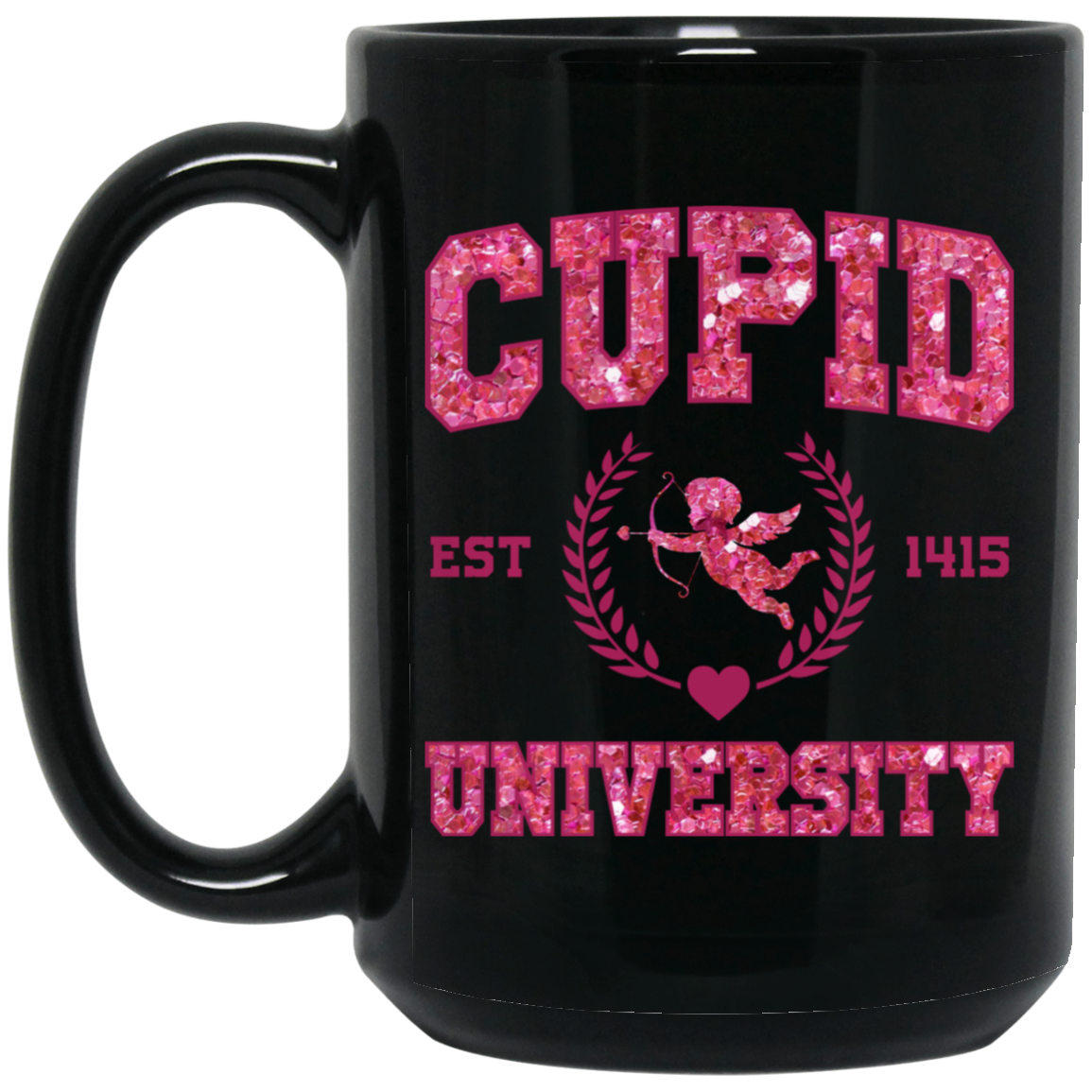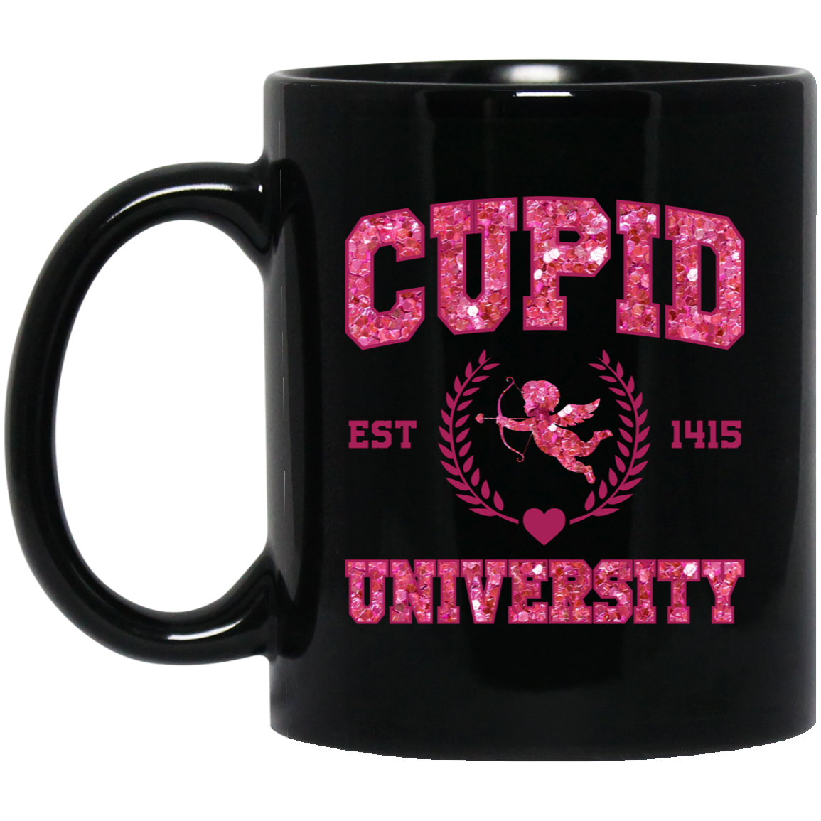 Cupid University, Est 1415, Pink Glitter Cupid, Glitter Valentine, Valentine's Day, Trendy Valentine Black Mug
