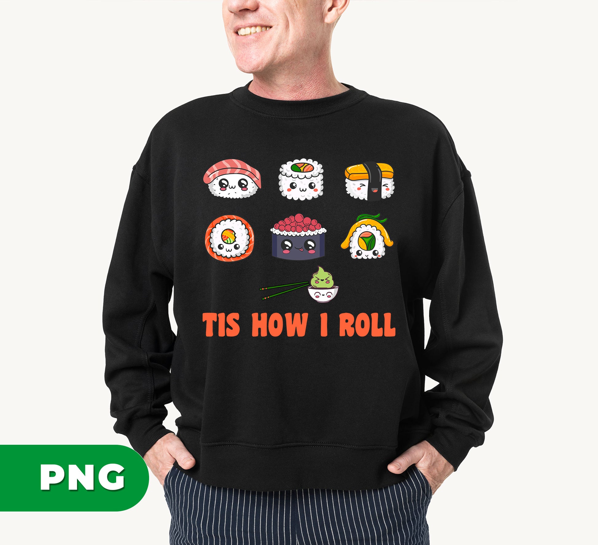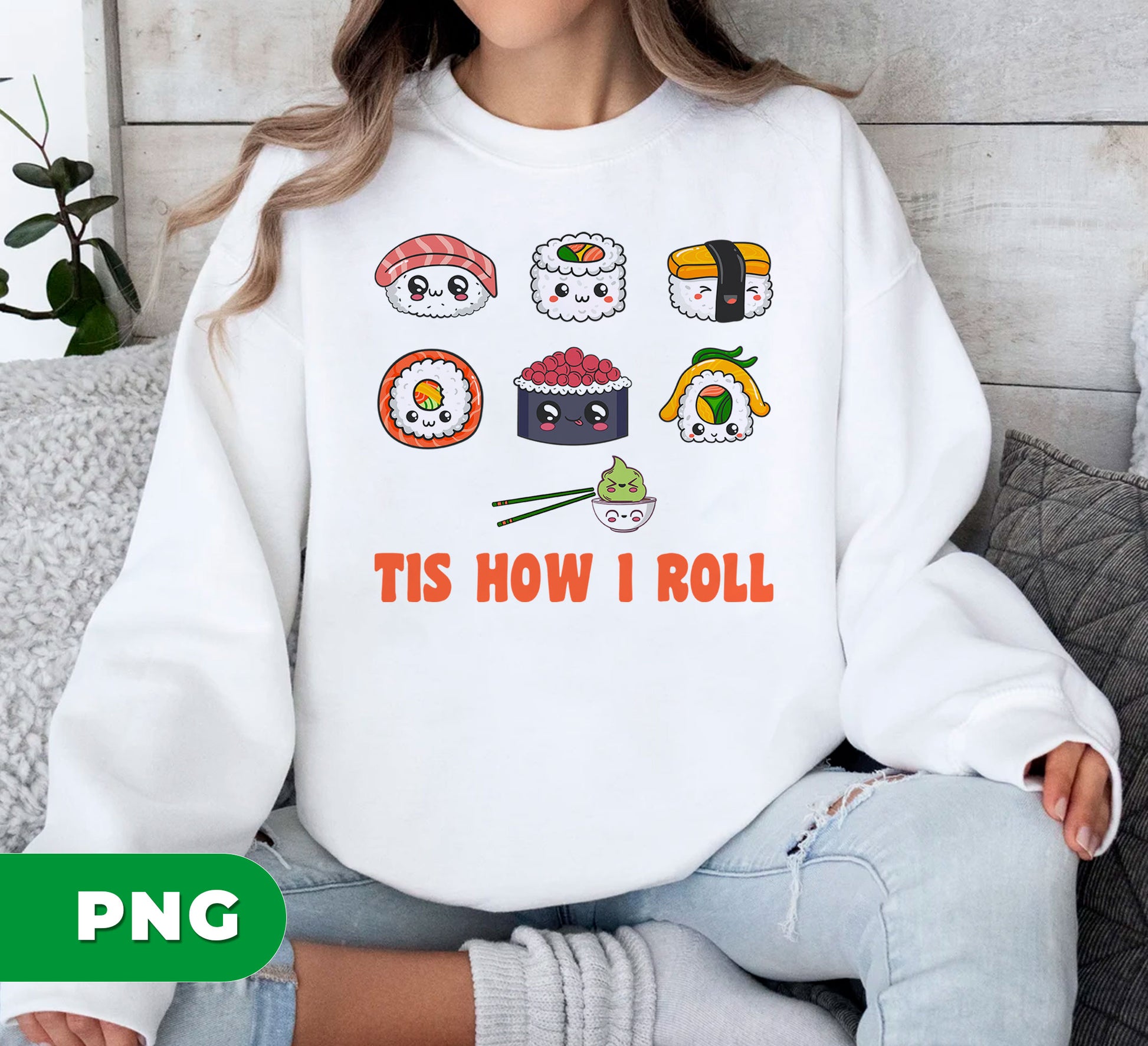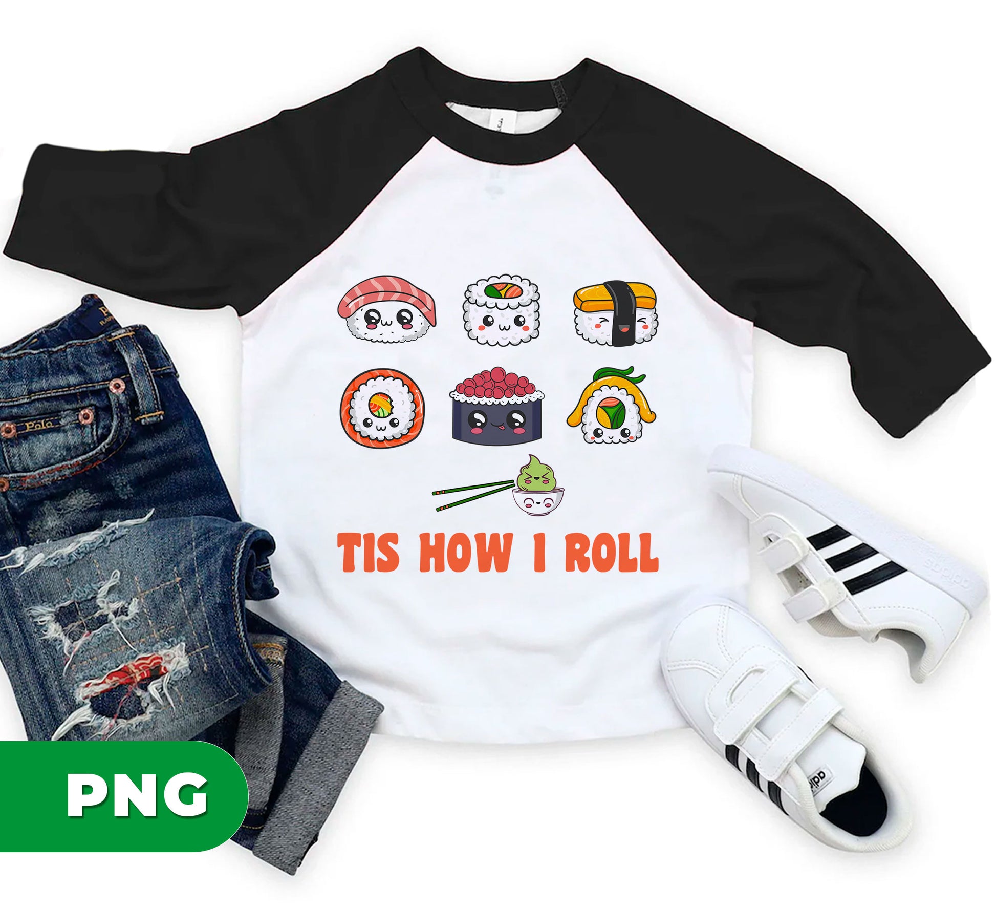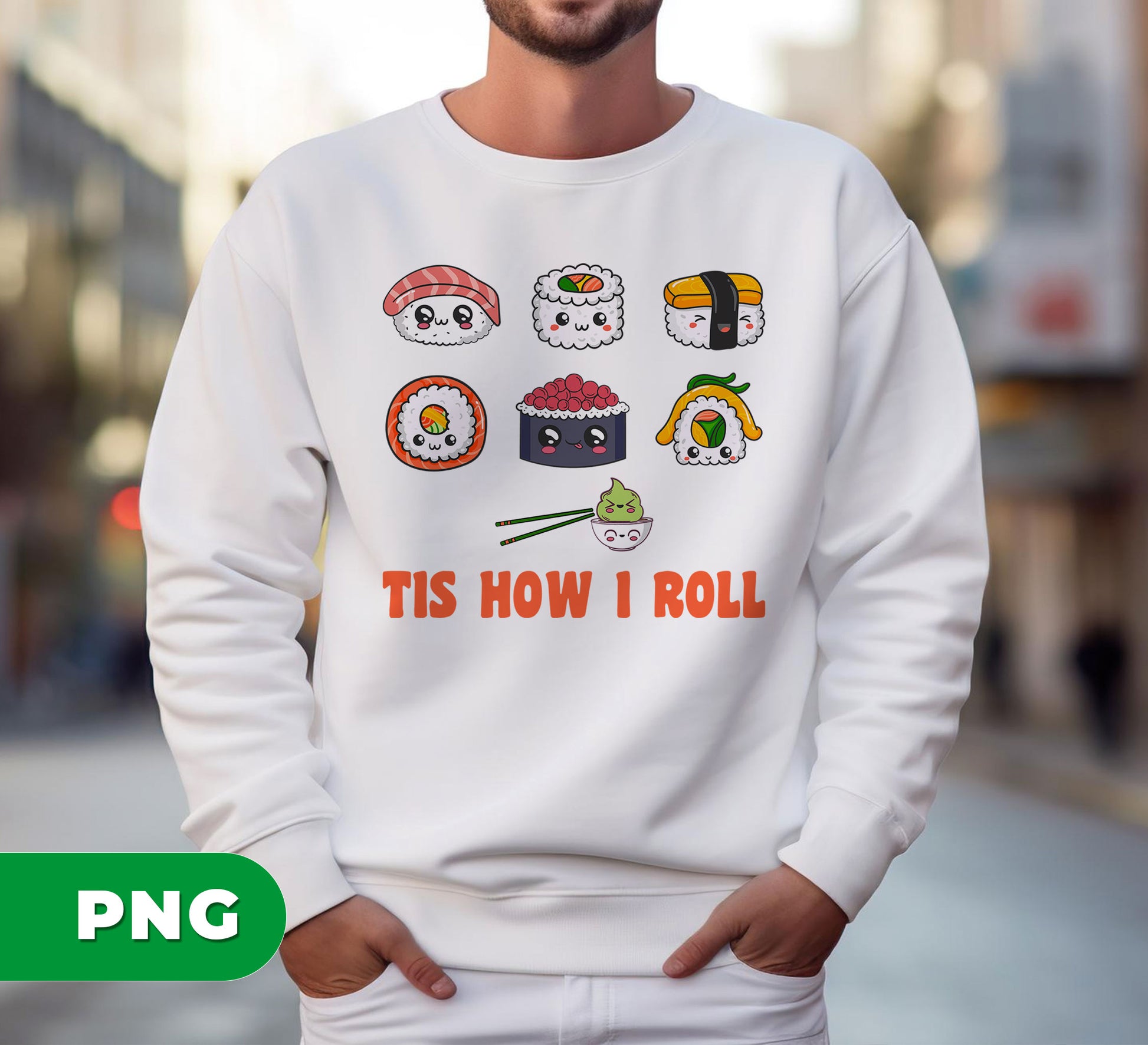 Add a playful touch to your apparel with this Cute Kawaii Sushi design featuring adorable Japanese cartoon sushi characters and a funny "Tis How I Roll" pun. Perfect for sublimation on shirts, this vibrant PNG brings charm and humor to any outfit, making sushi lovers smile wherever they go.