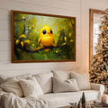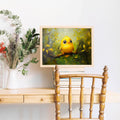 A heartwarming and whimsical oil painting of an incredibly cute, fluffy yellow bird with large, soulful eyes perched on a mossy tree branch. The artwork features soft, painterly textures and a dreamy, out-of-focus forest background with dappled sunlight filtering through green and gold leaves. This charming piece captures a sense of innocence and wonder, making it a perfect addition to a child's nursery, a cozy reading nook, or as a cheerful gift for bird lovers and nature enthusiasts.
