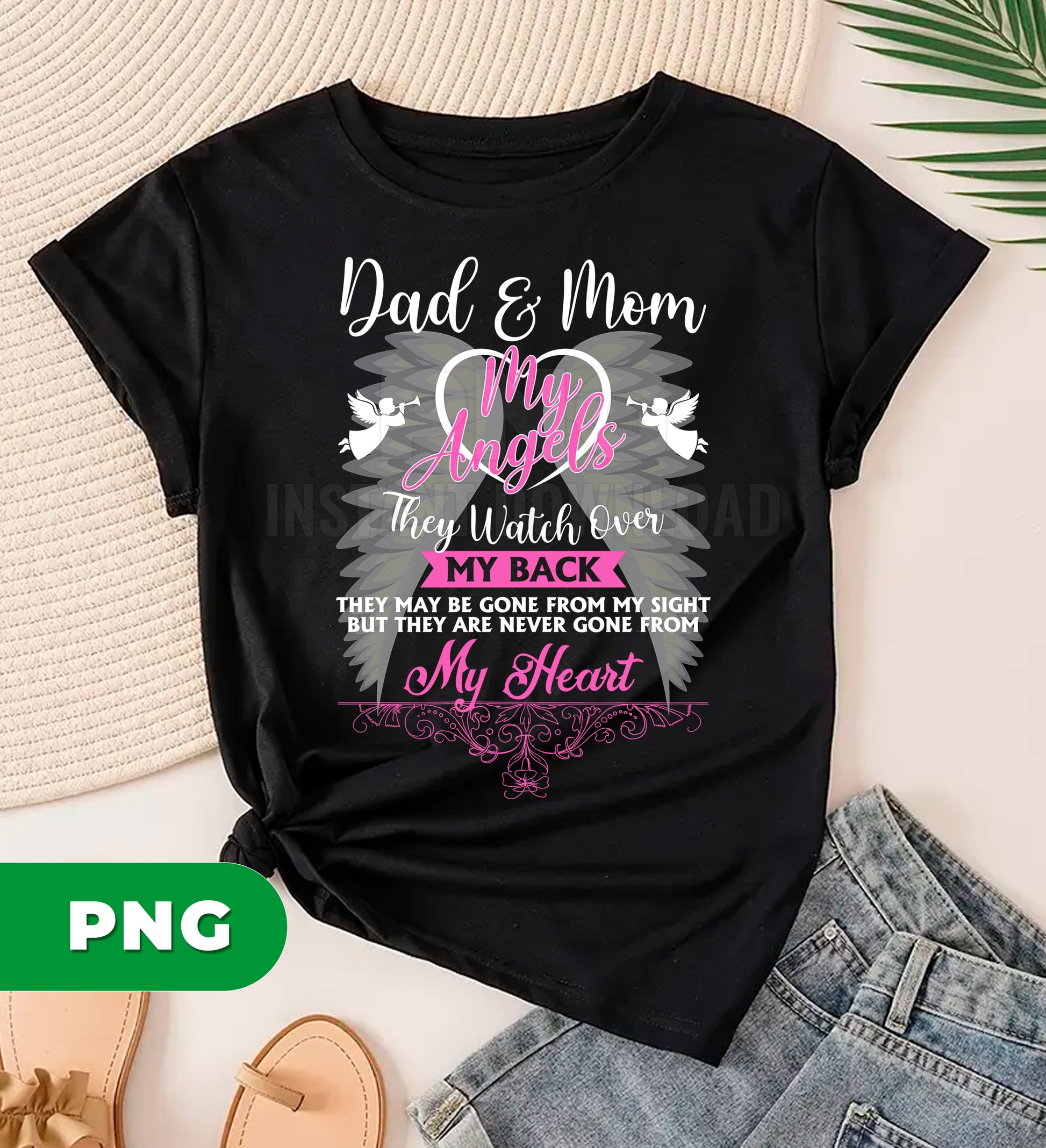 Honor the cherished memories of your parents with this heartfelt memorial design. Perfect for personalized gifts, apparel, or keepsakes, this PNG graphic captures a touching tribute to those watching over you. The elegant script and meaningful message create a beautiful way to celebrate their enduring presence in your life. Ideal for custom t-shirts, mugs, pillows, or framed prints that keep their love close to your heart.