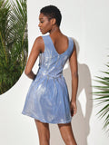 Introducing our Denim Silver Metallic Dress: A Cutout and Draped Masterpiece. This dress, crafted with precision and artistry, features a stunning silver metallic fabric, intricate cutouts, and elegant draping. With its unique design and exquisite details, it will make you stand out at any event. Elevate your wardrobe with this must-have piece.