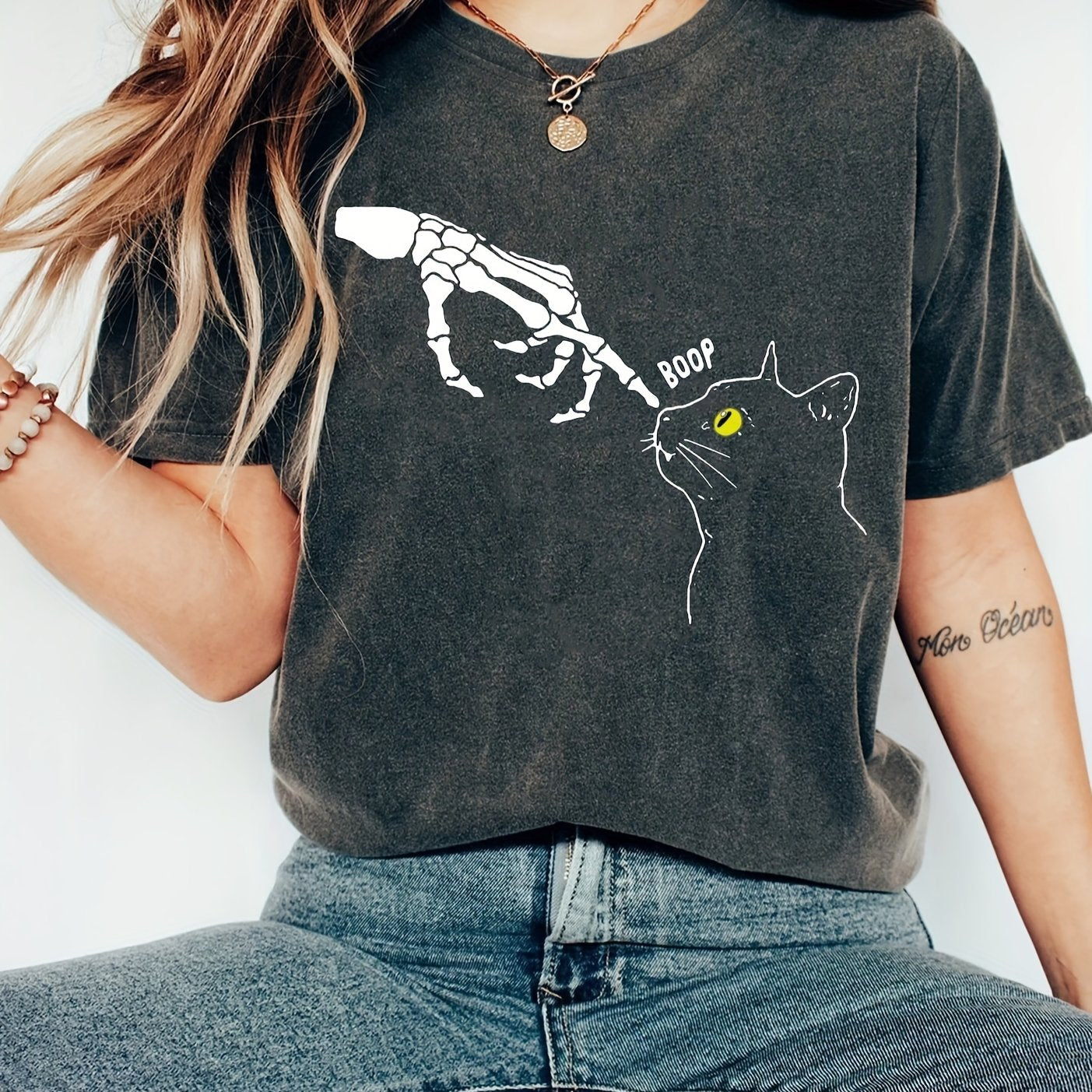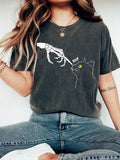 Edgy and Chic: Skeleton Hand Cat Print T-Shirt - A Must-Have for Spring/Summer!