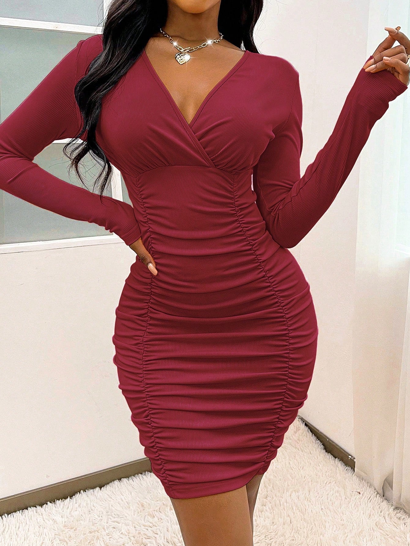Effortless Elegance: Women's V-Neck Gathered Hem Minimalist Short Dress