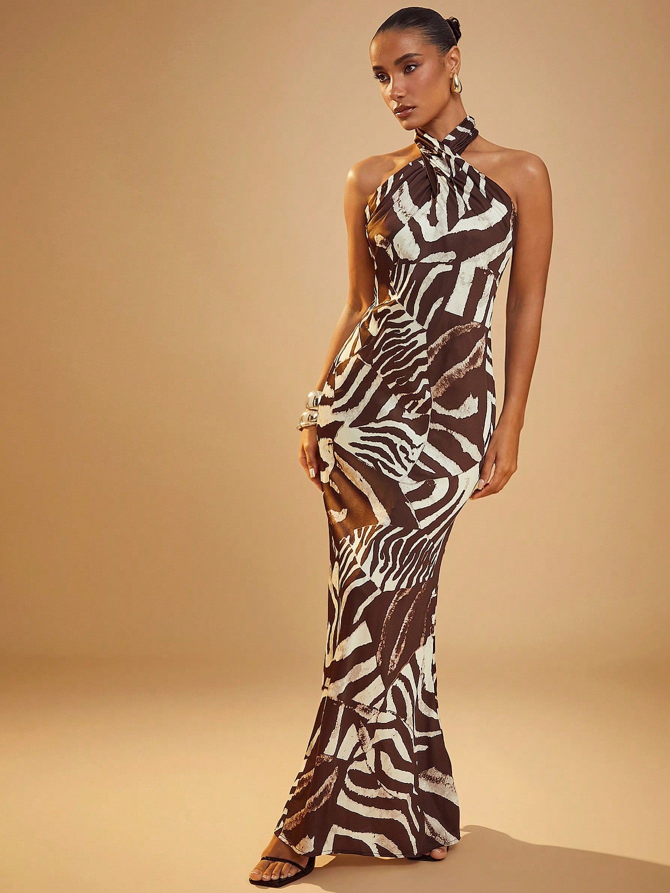 Effortlessly chic with an elegant animal print, this maxi dress is perfect for any occasion. With its cross halter design, you'll feel stylish and comfortable at the same time. Be the talk of the town in this versatile and fashionable dress.