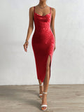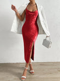 This elegant backless cami dress features a draped collar and split thigh design, creating a sophisticated and stylish look. The open back accentuates your curves while the split thigh adds a touch of seductiveness. Perfect for any special occasion or night out.