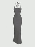 Elegant Backless Halter Fishtail Dress in Solid Colors – Perfect for Special Occasions