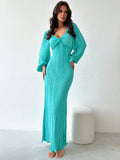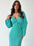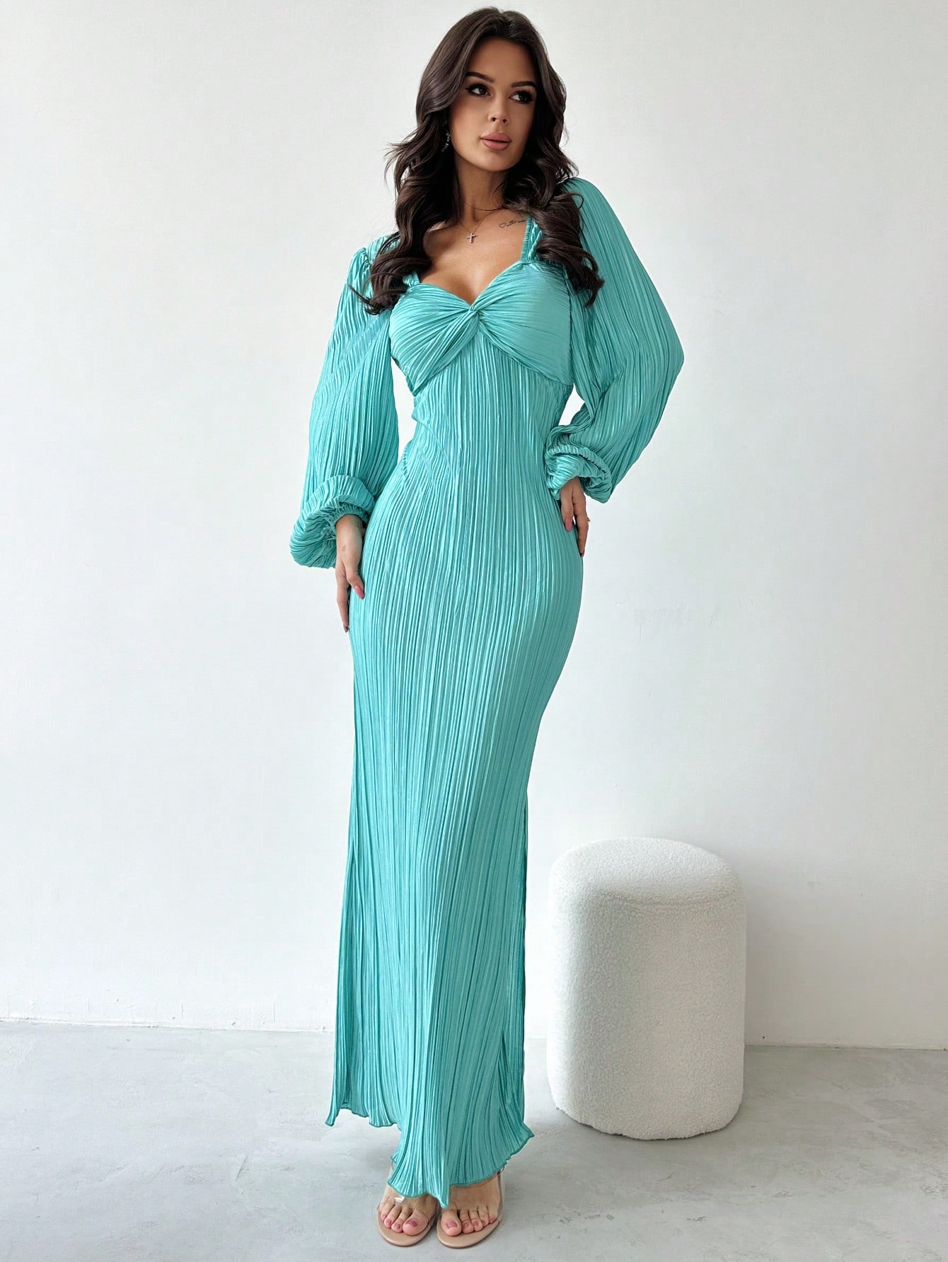 Elegant Blue Pleated Twist-Front Dress with Puff Sleeves for Autumn & Winter