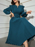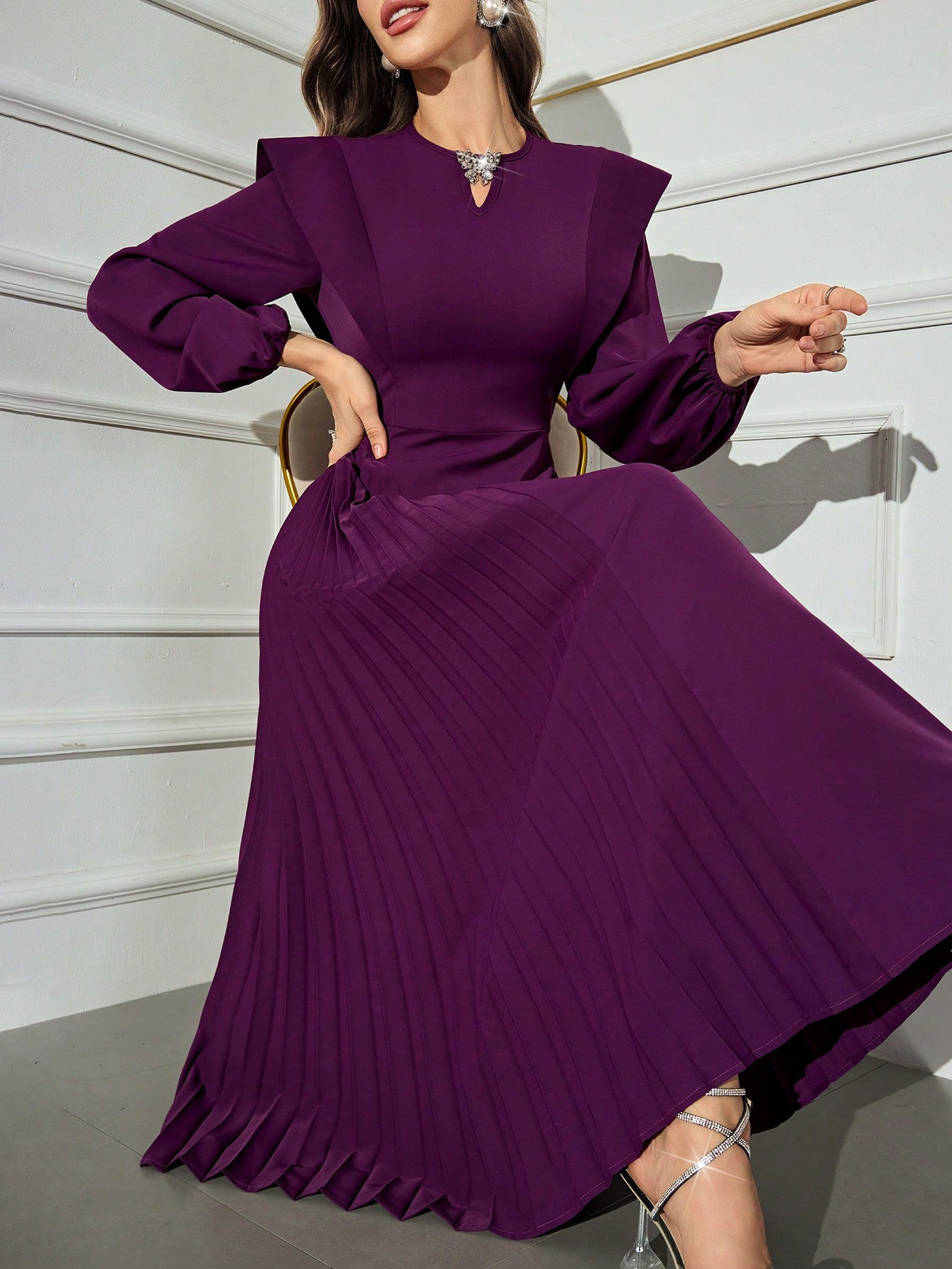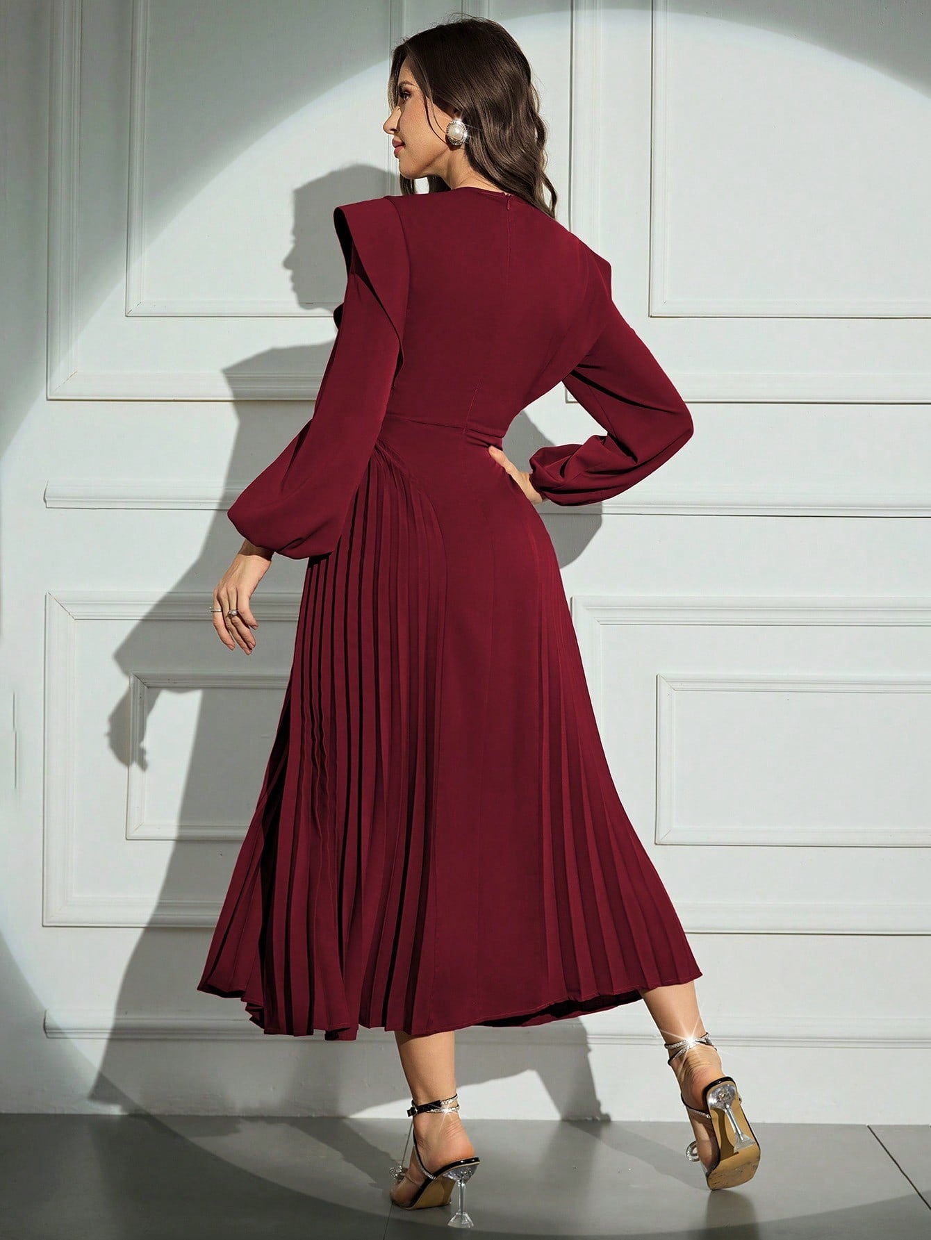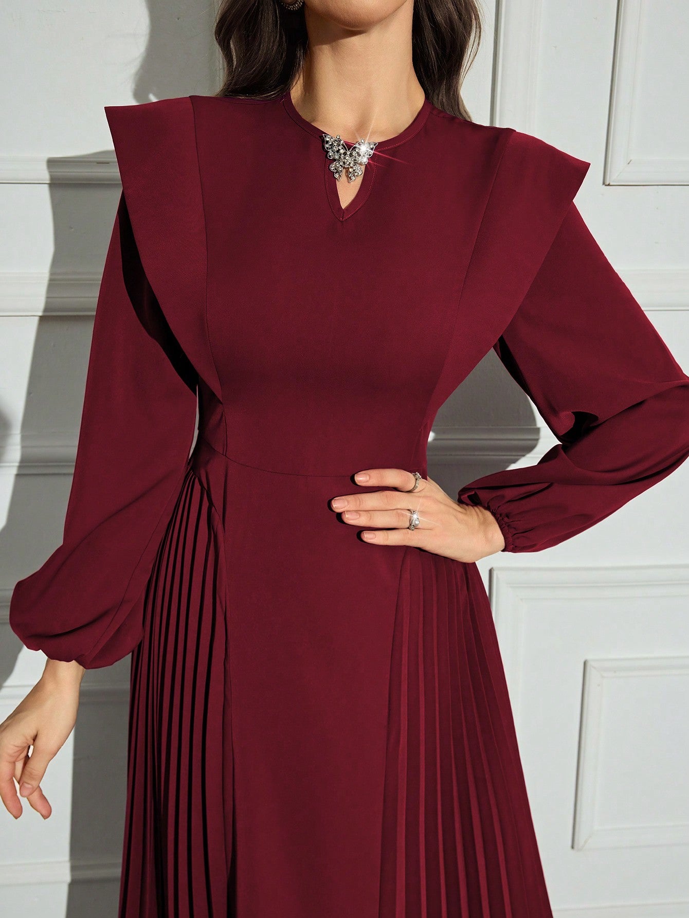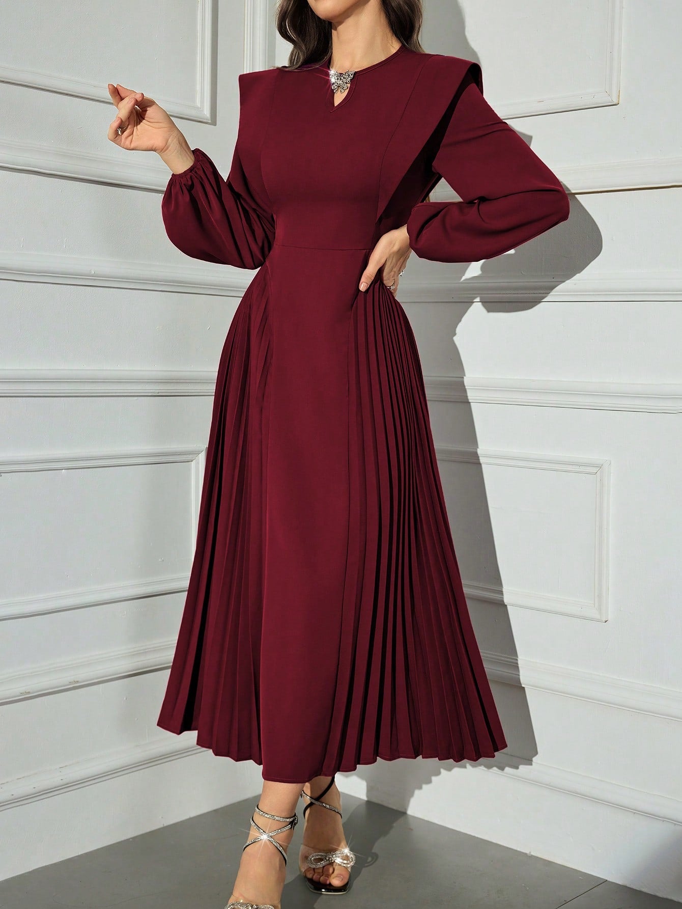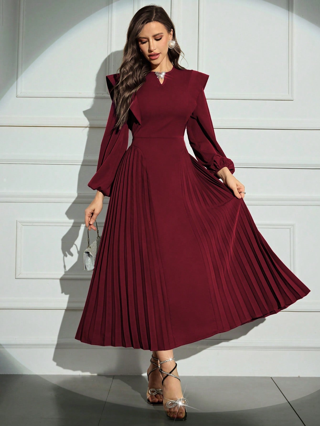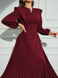 Elegant Burgundy Red Keyhole Neckline Lantern Sleeve Dress with Pleated Hem