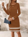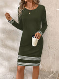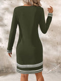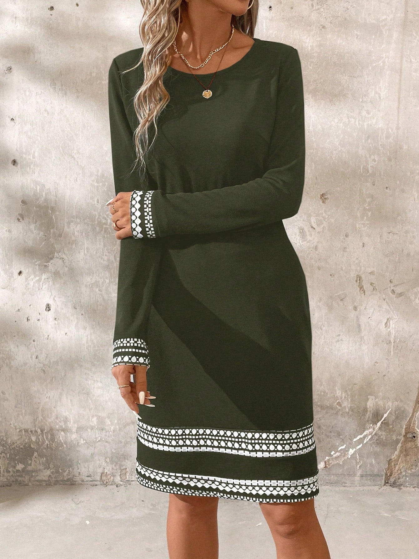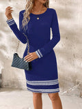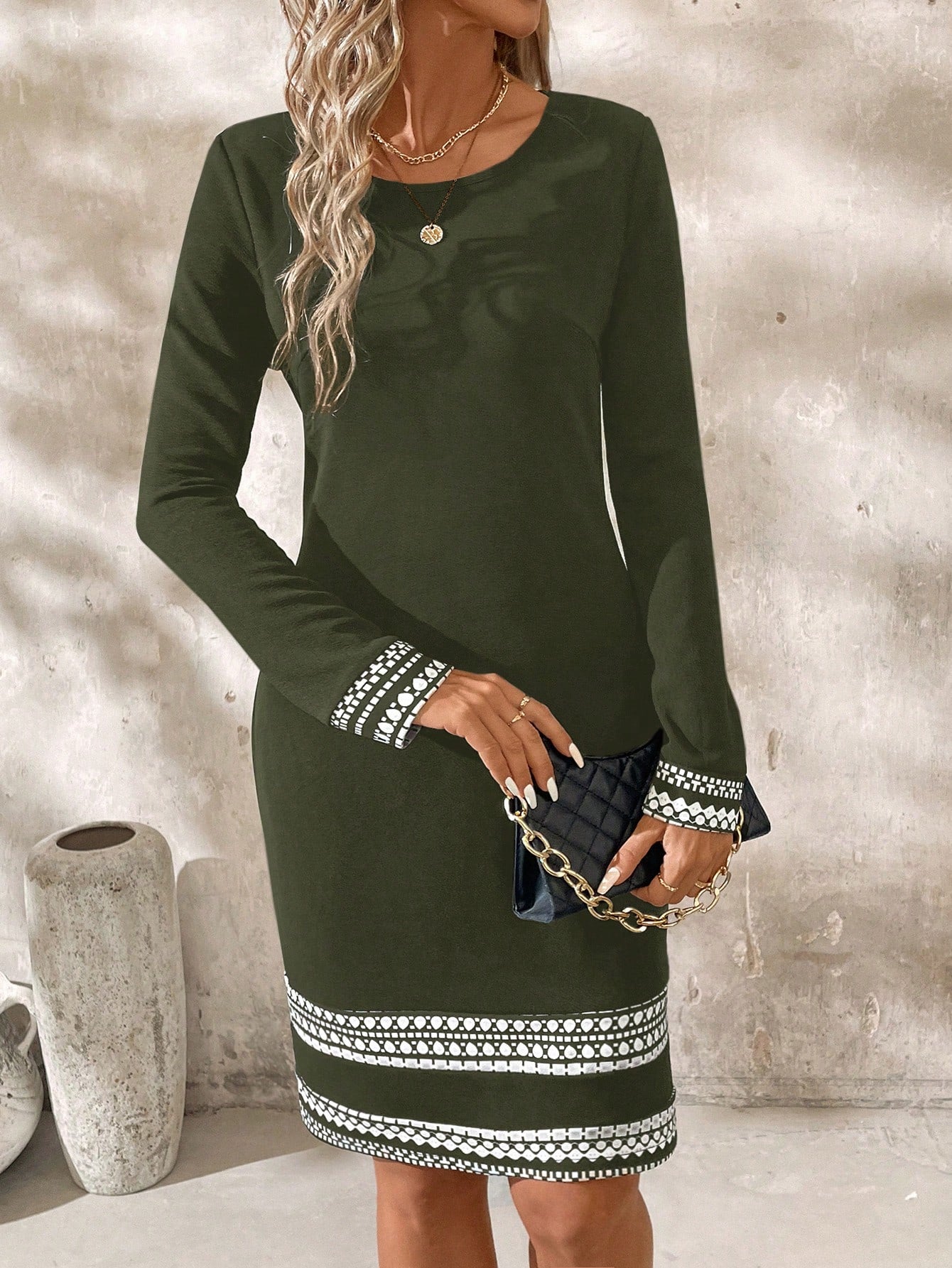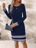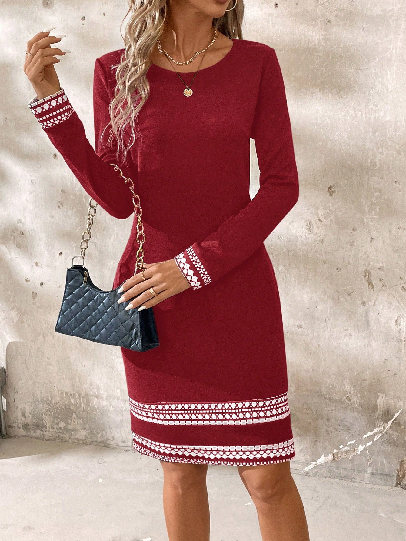 Elegant Contrast Color Geometric Print Long Sleeve Fitted Dress for Spring & Autumn
