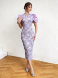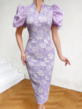 Elegant Floral Jacquard Dress with Short Puff Sleeves – Chic Slim Fit for Effortless Style