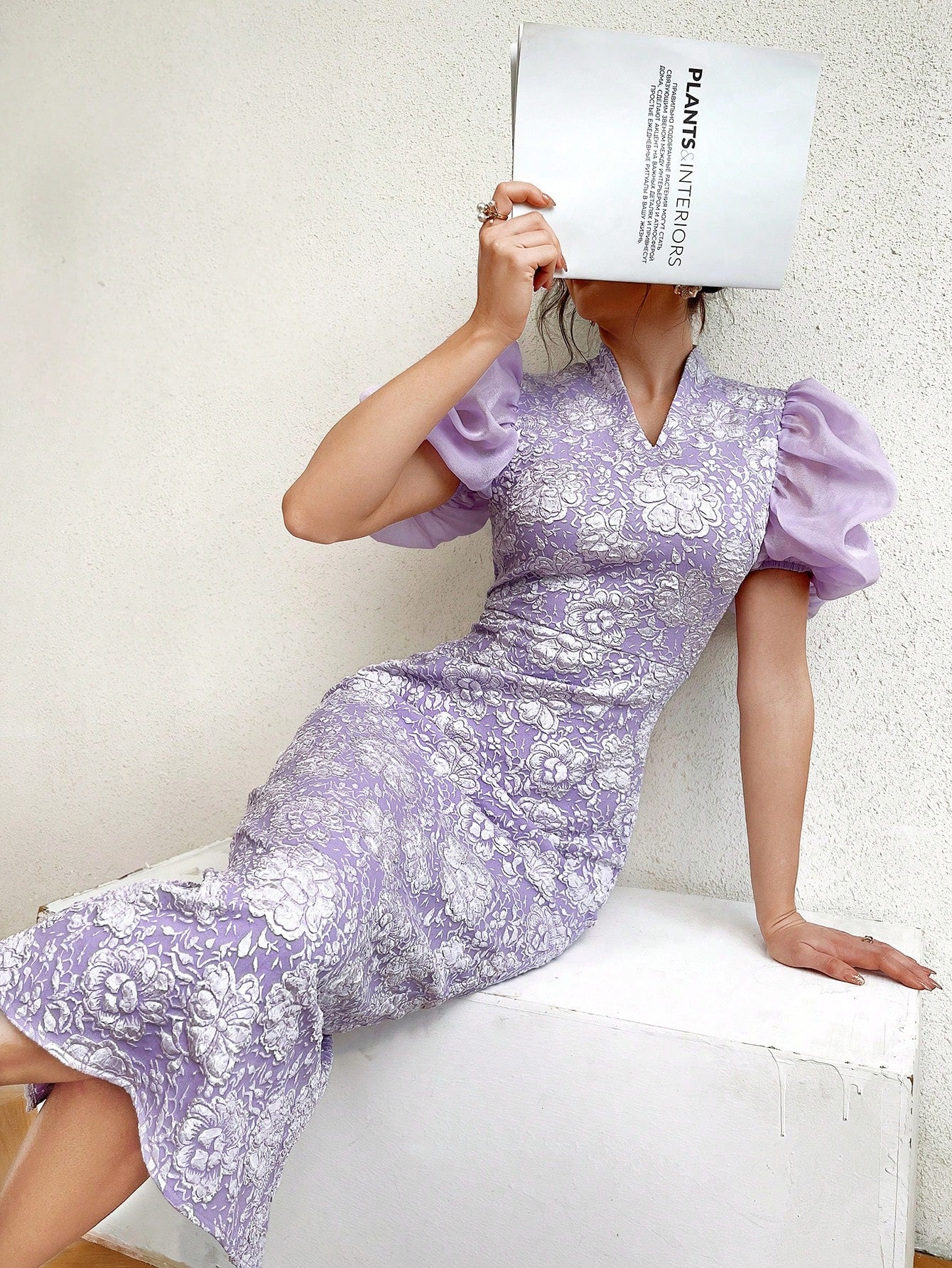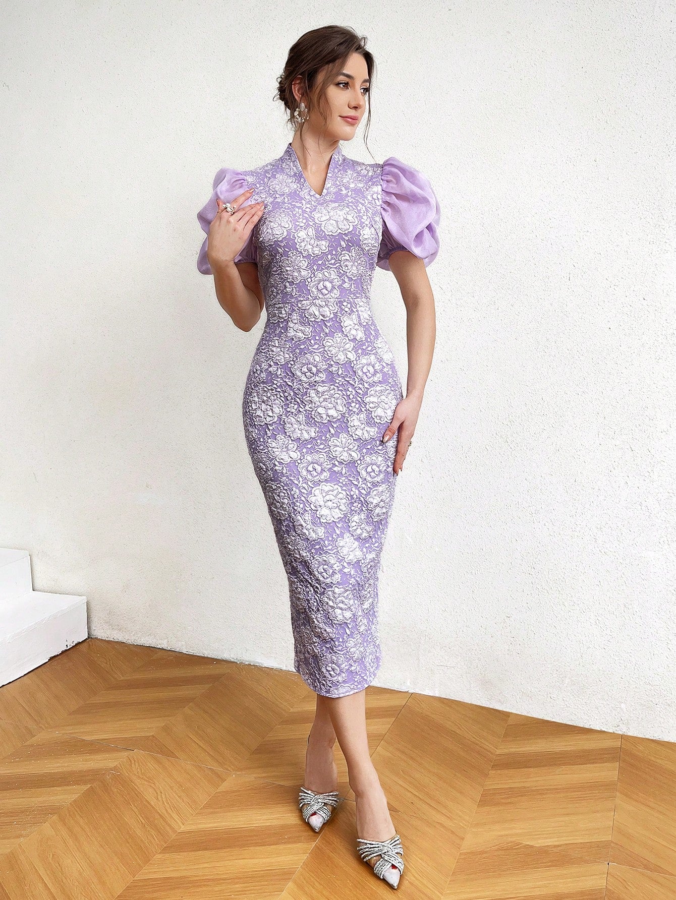 Effortlessly chic and stylish, our Elegant Floral Jacquard Dress will make you stand out in any crowd. The slim fit hugs your curves in all the right places, while the short puff sleeves add a playful touch. Perfect for any occasion, this dress will guarantee you effortless style and endless compliments.