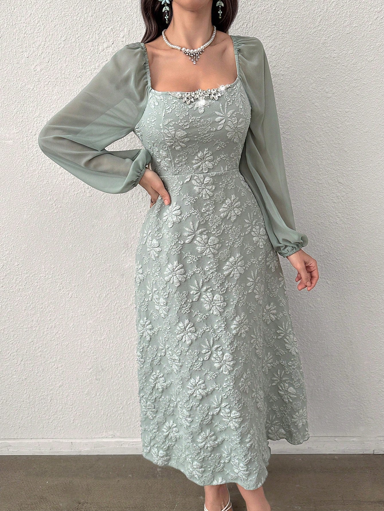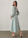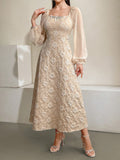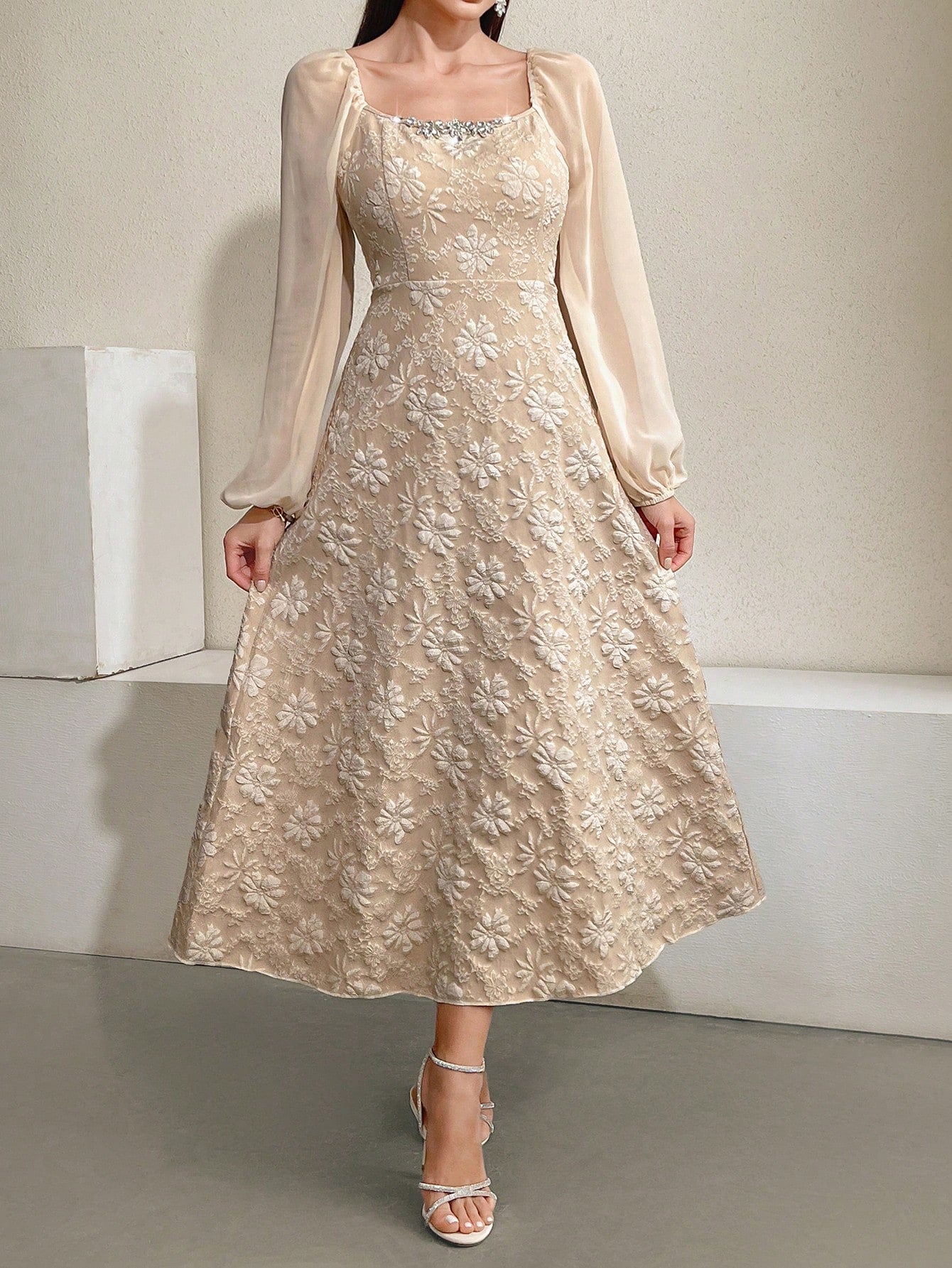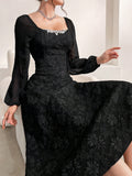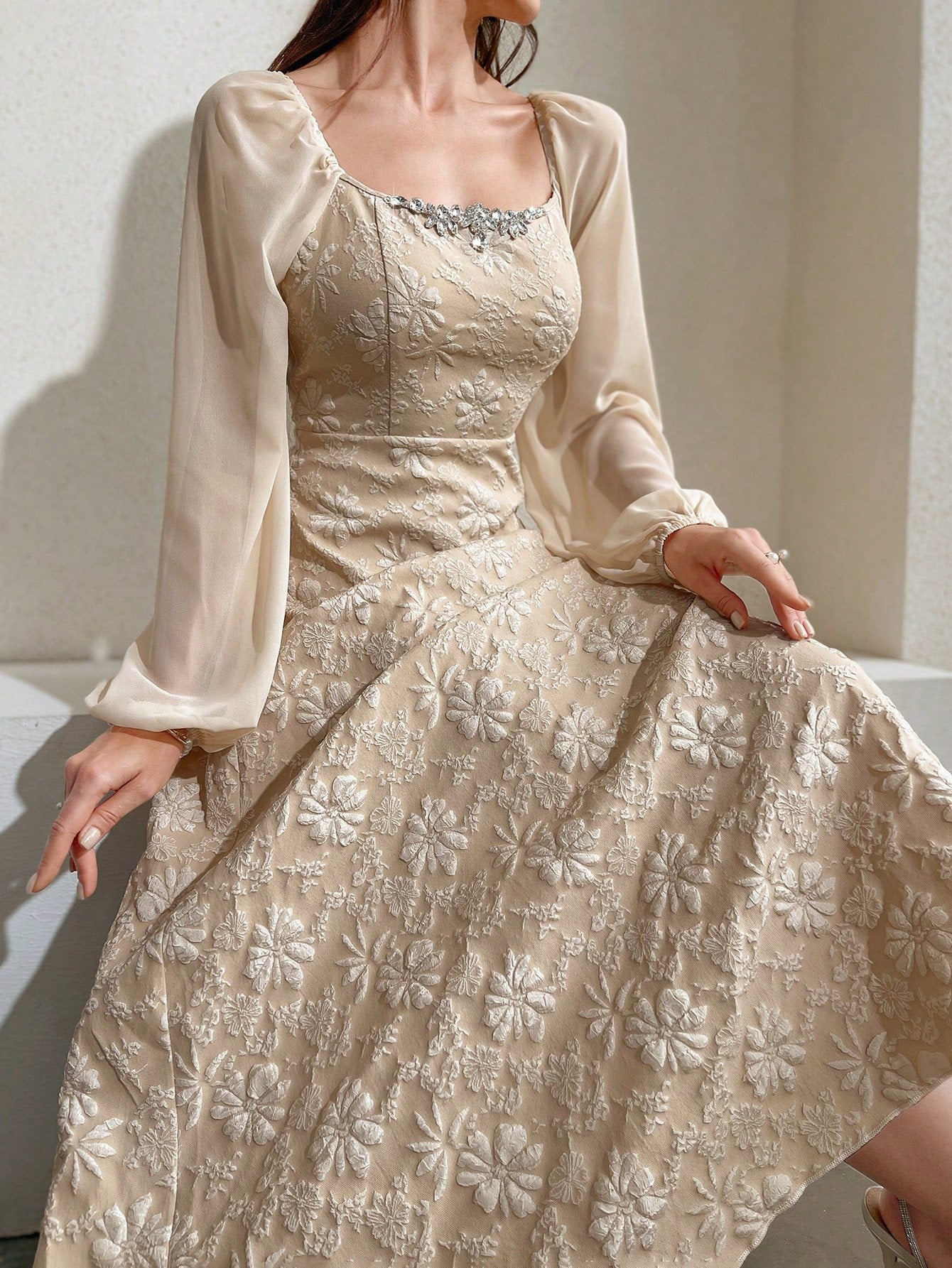 Elegant Floral Jacquard Lantern Sleeve Dress for Spring and Summer