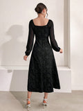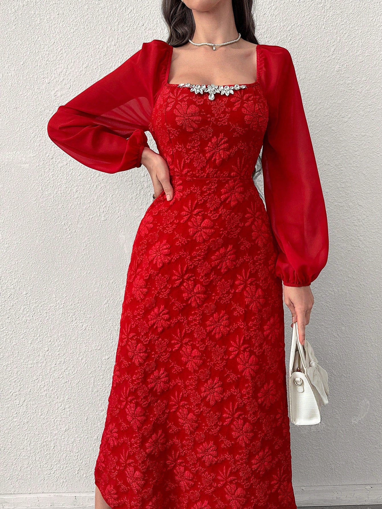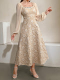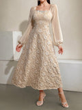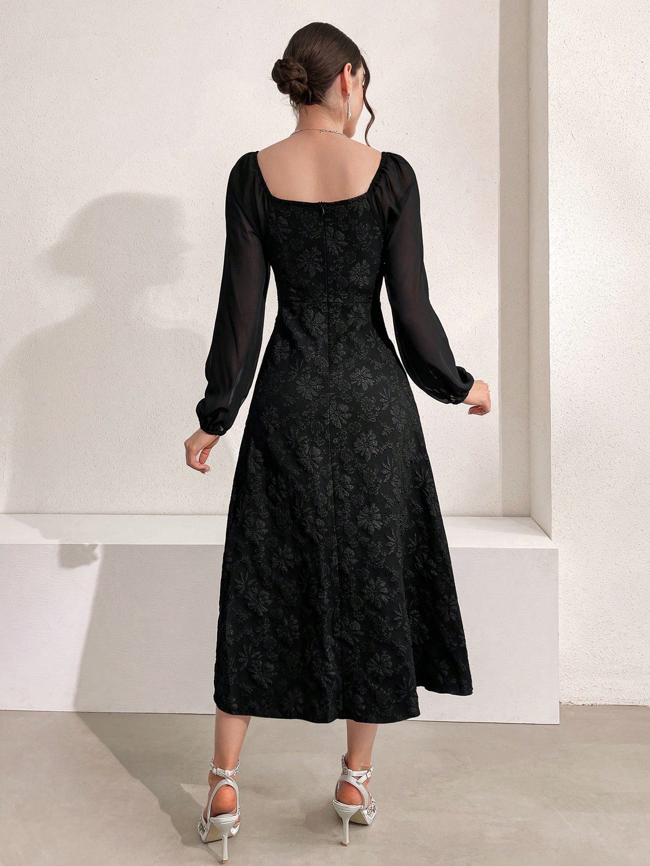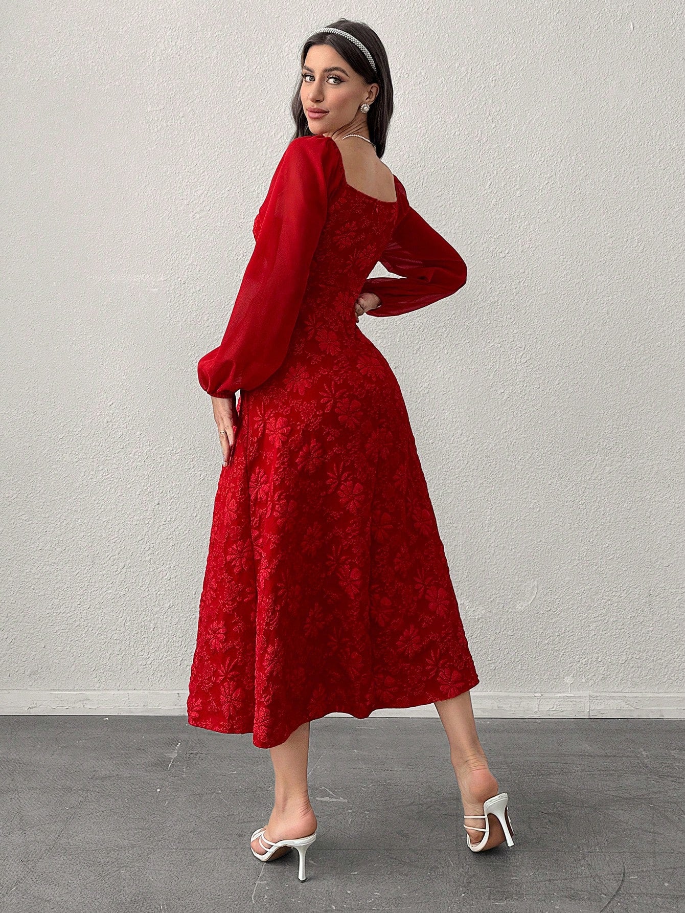 Elegant Floral Jacquard Lantern Sleeve Dress for Spring and Summer