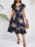 Elegant Floral Print Midi Dress with Ruffle Trim and Belt - Perfect for Every Occasion
