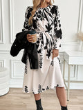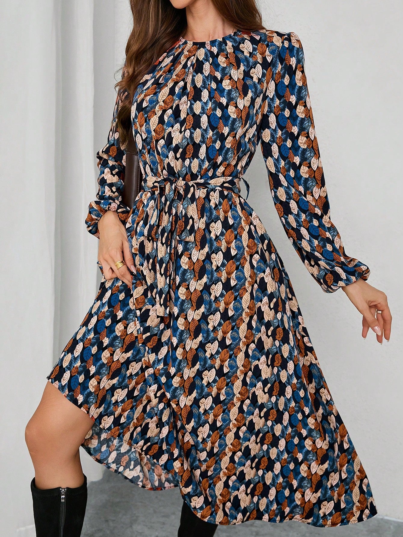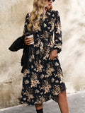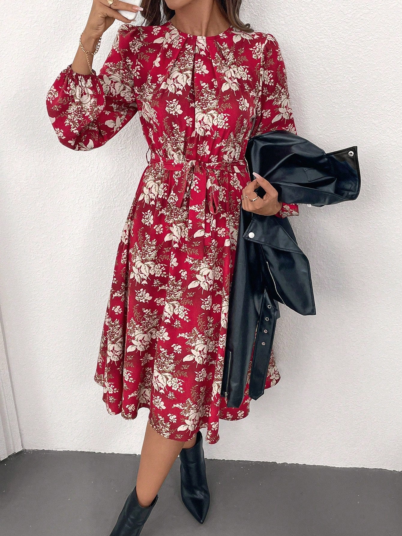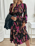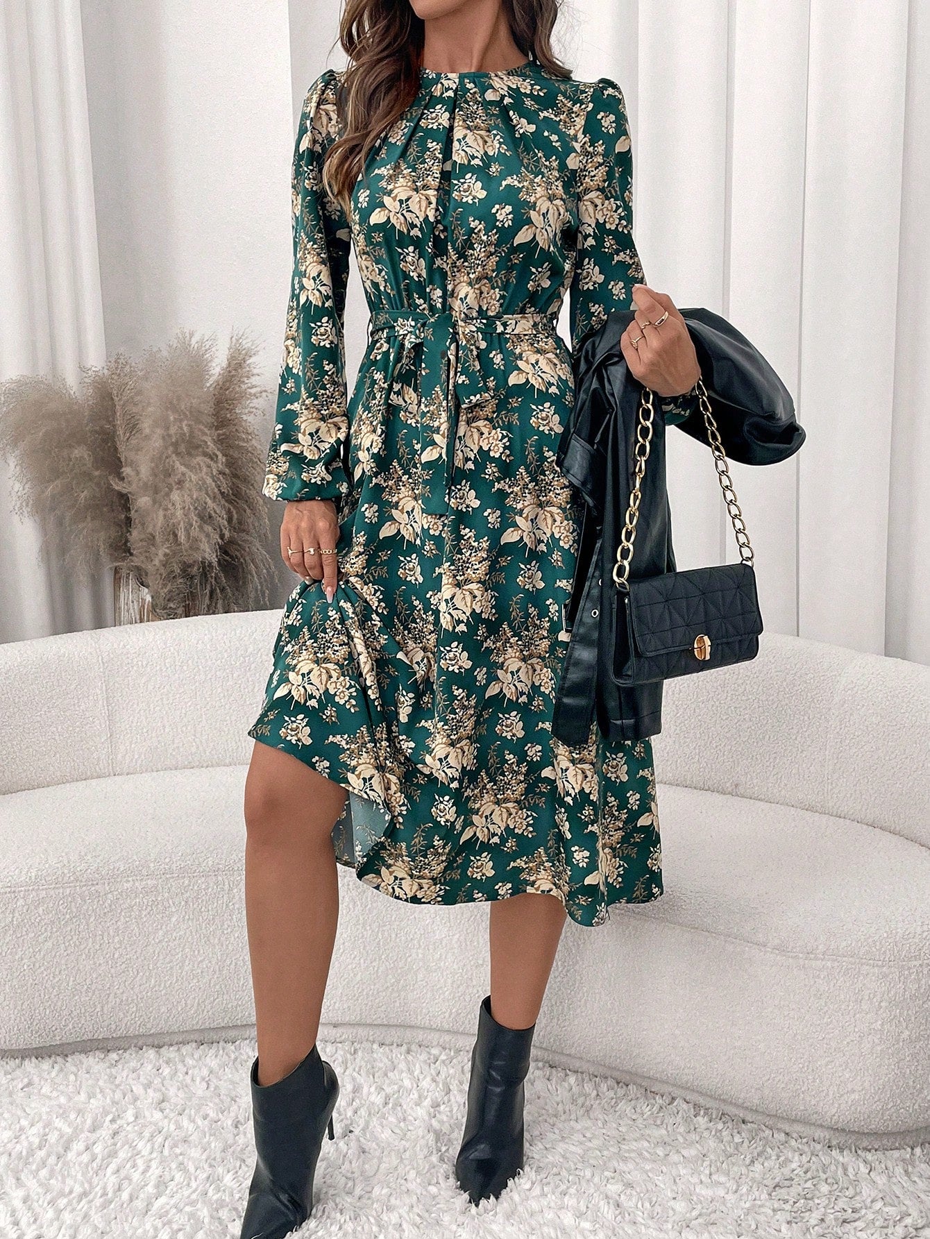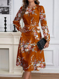 Elegant Floral Print Ruched Neck Long Sleeve Dress for Women