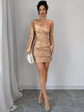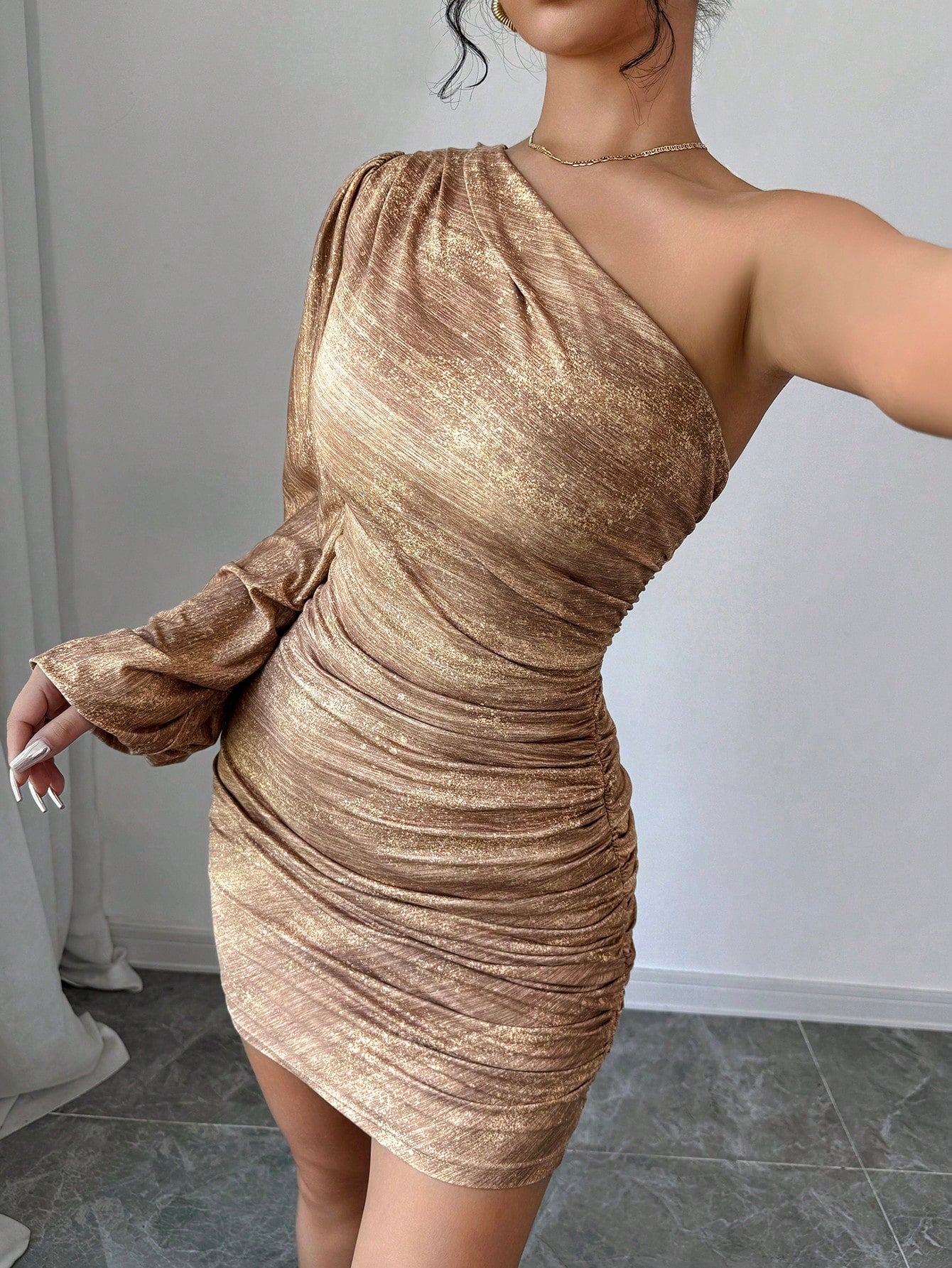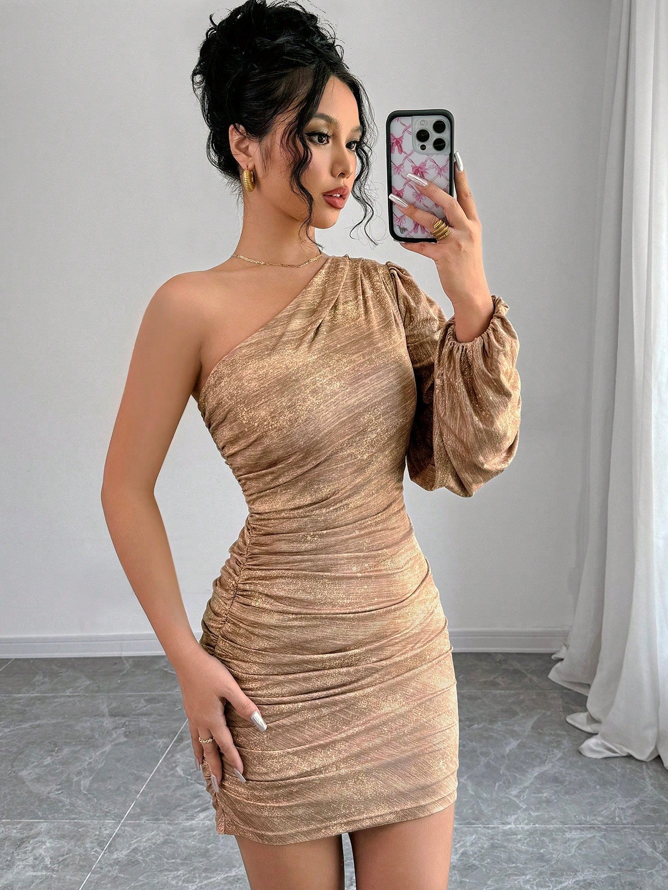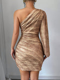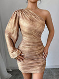 Elegant Gold One-Shoulder Lantern Sleeve Mini Dress - Perfect for Parties and Fall Events!