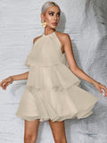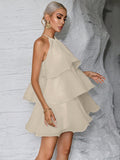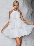 Elegant Halter Neck Wedding Guest Dress with Layered Hem - Timeless White Elegance