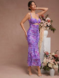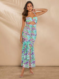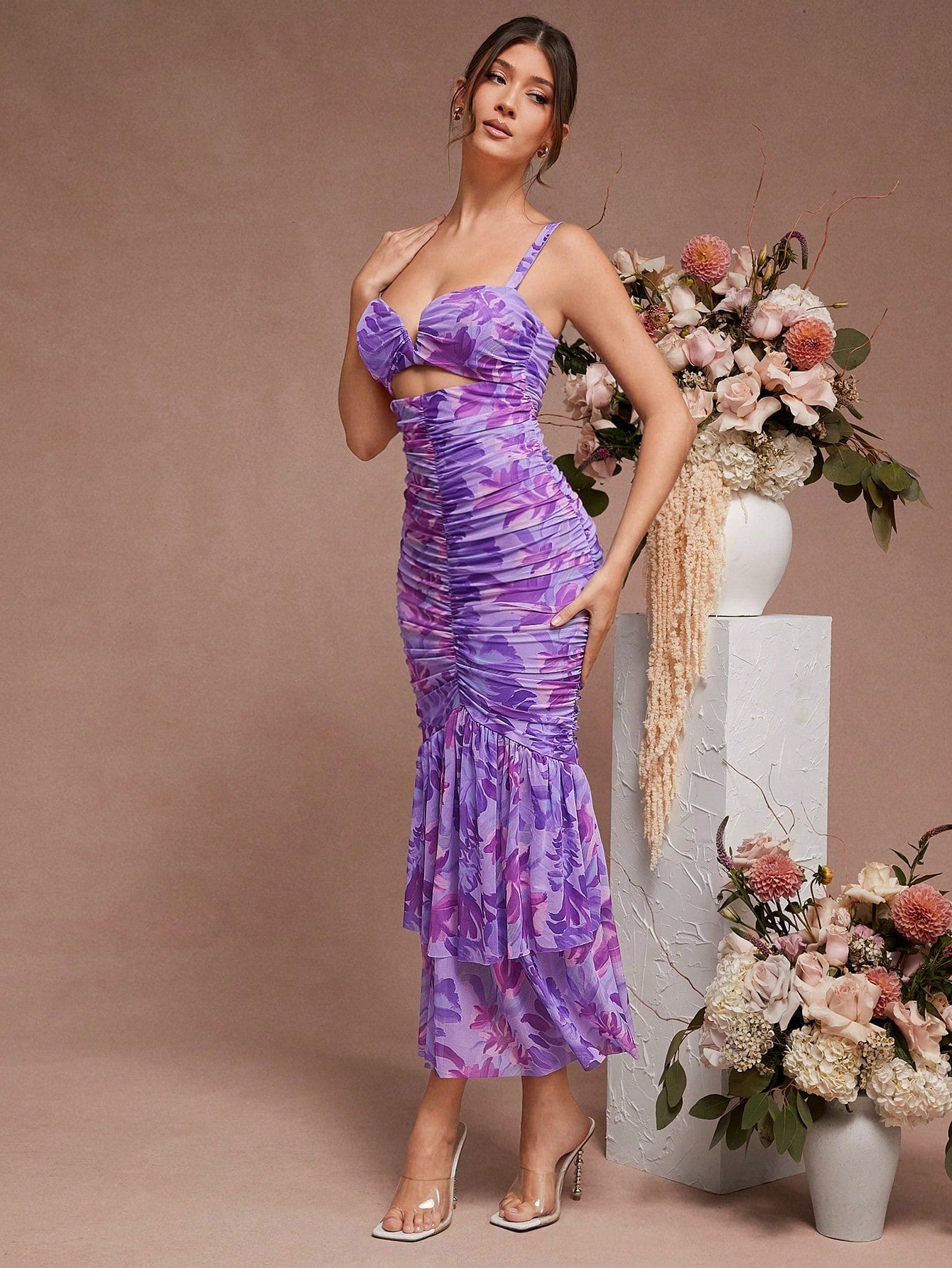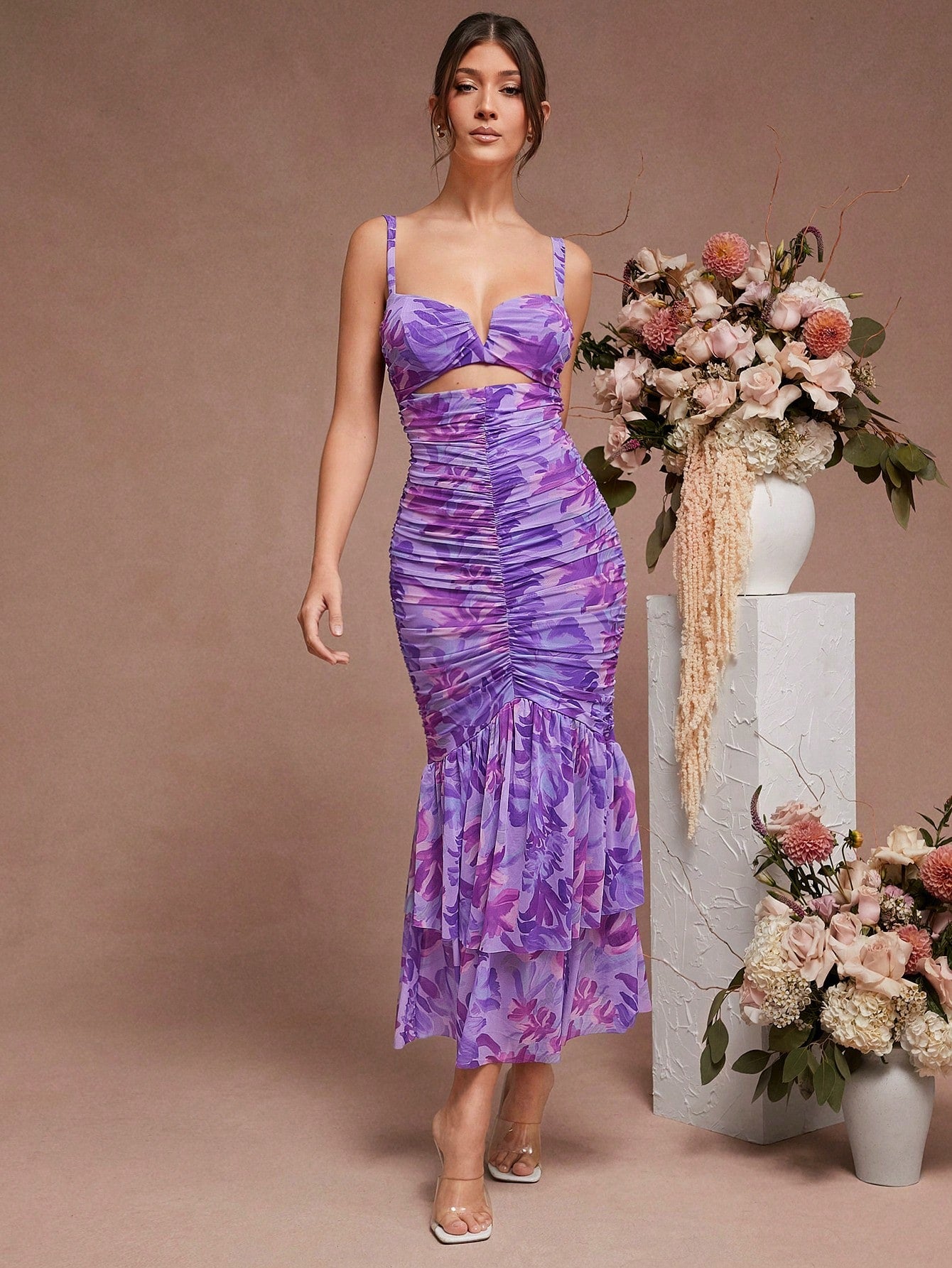 Elegant Haute Floral Ruched Mermaid Hem Dress with Chic Cutout Details