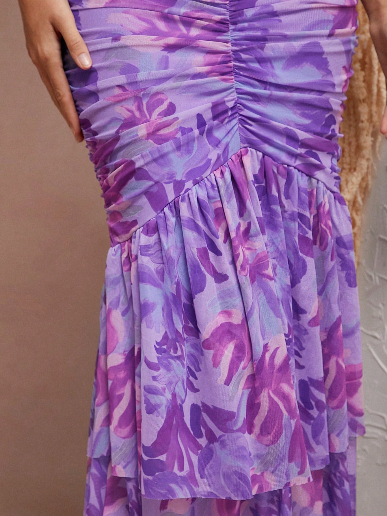 Expertly crafted with intricate details, the Elegant Haute Floral Dress is a stunning addition to your wardrobe. The mermaid hem and chic cutout details add a touch of elegance, while the ruched design flatters your figure. Perfect for any occasion, this dress effortlessly combines style and sophistication.