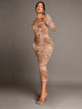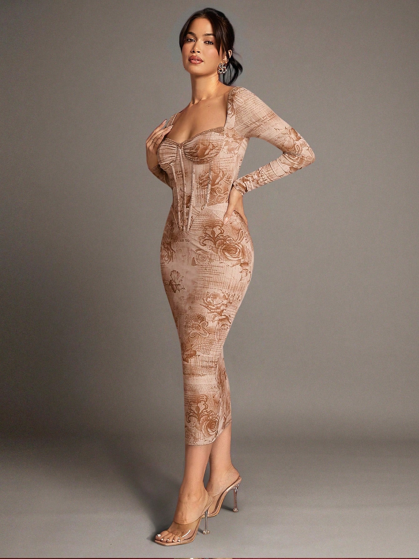 Elegant Lace Mesh Corset Dress with Square Neckline and Long Sleeves