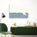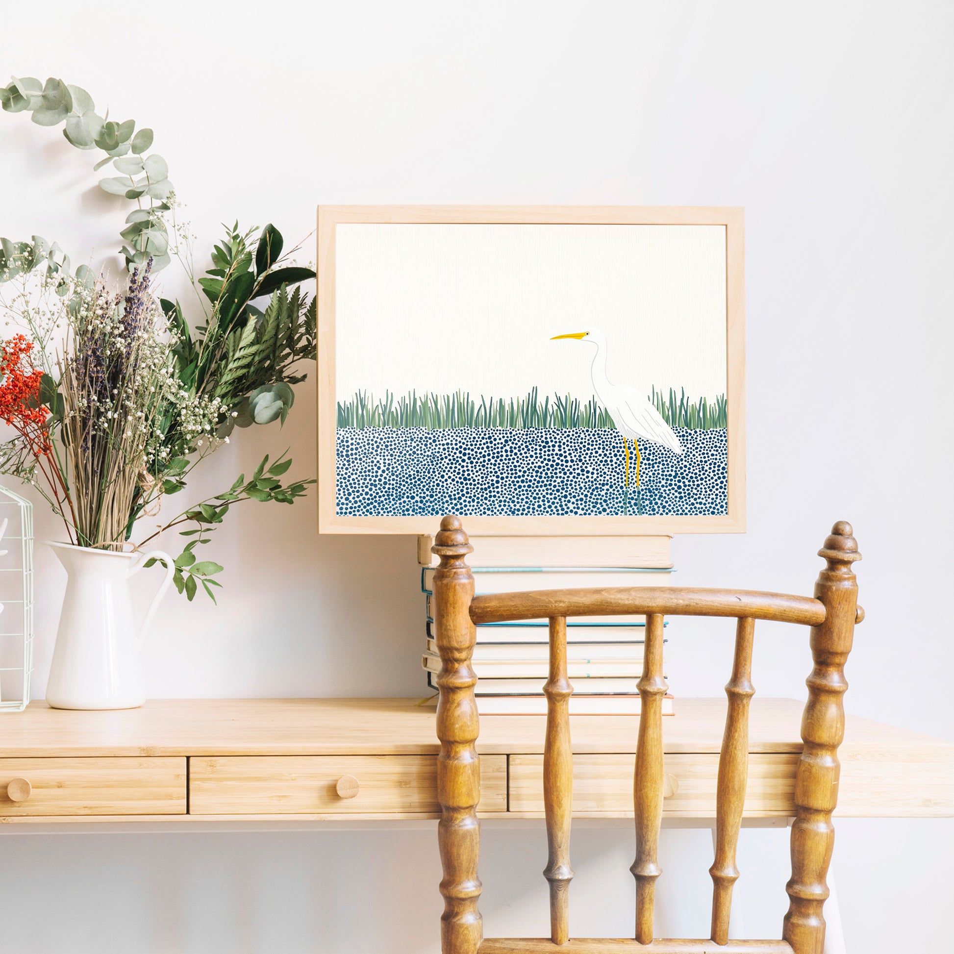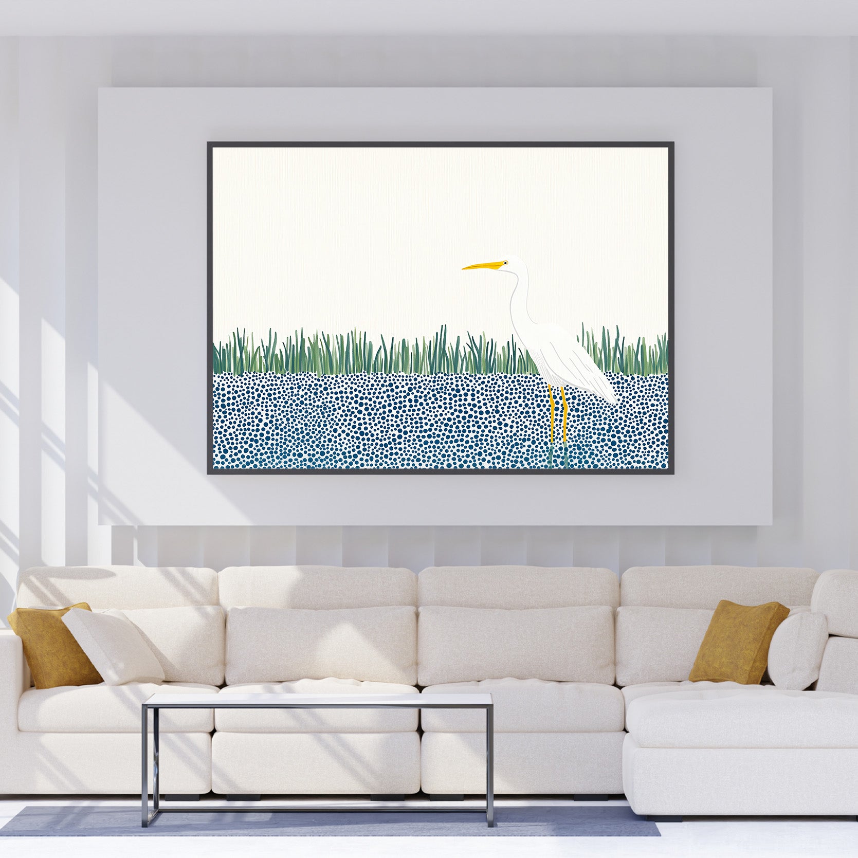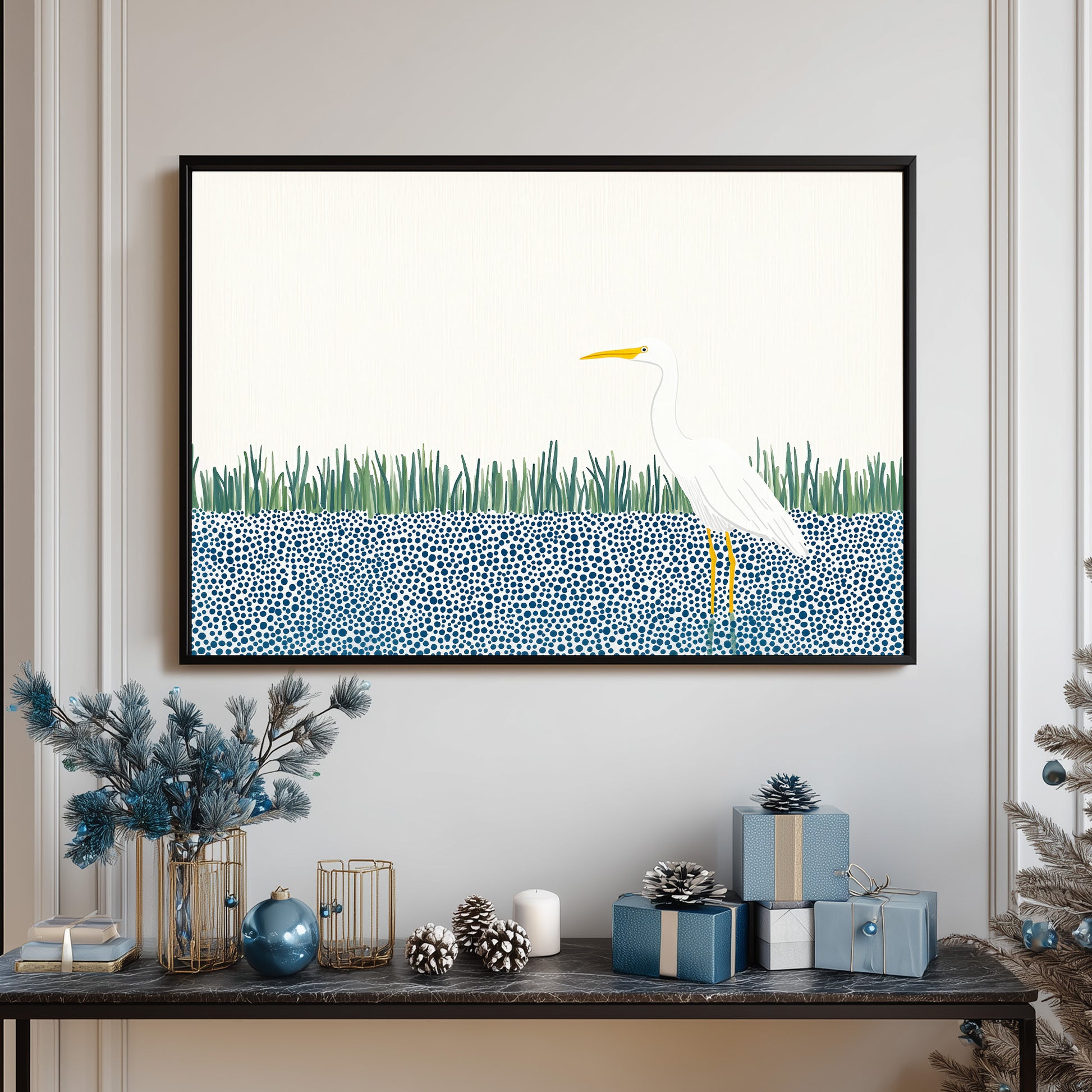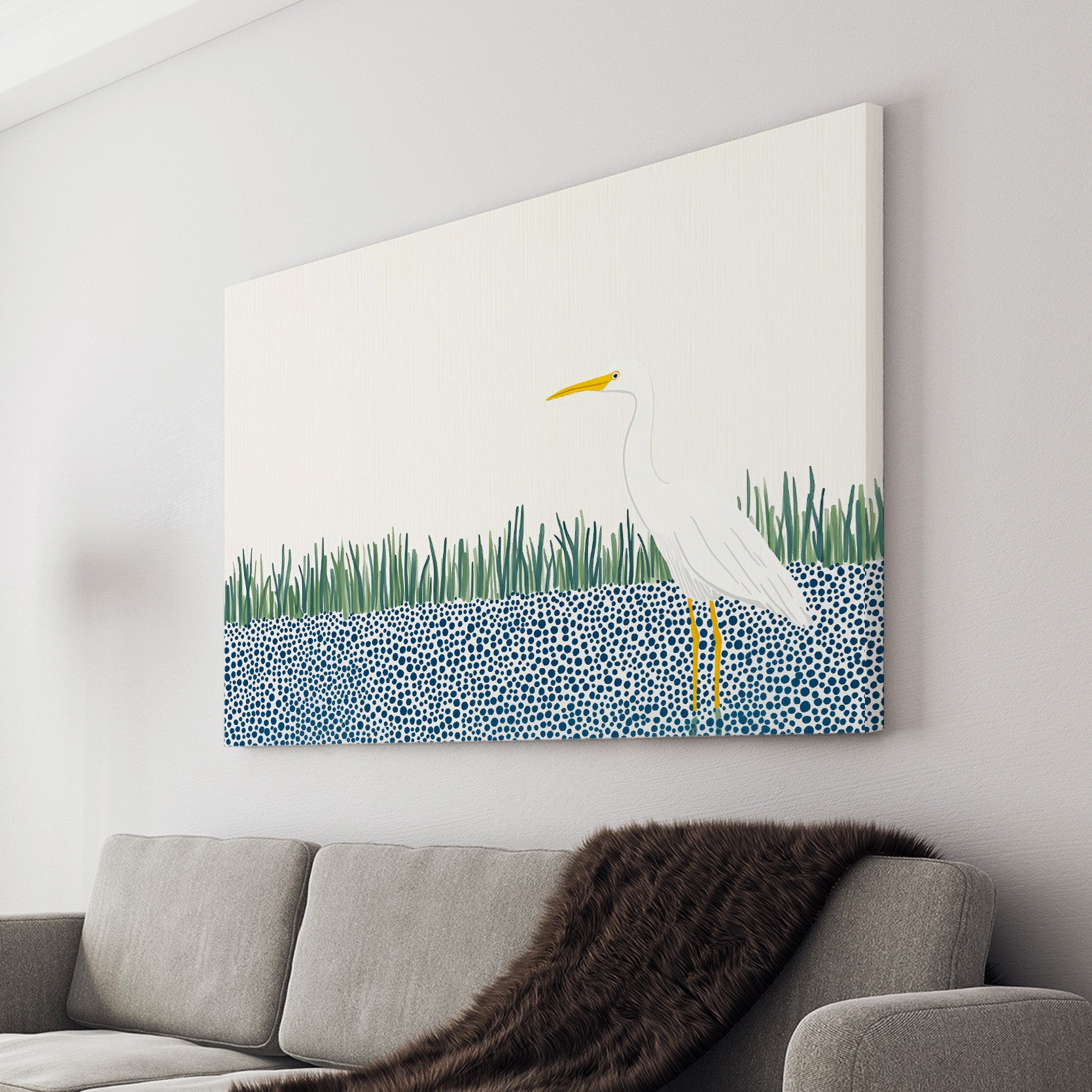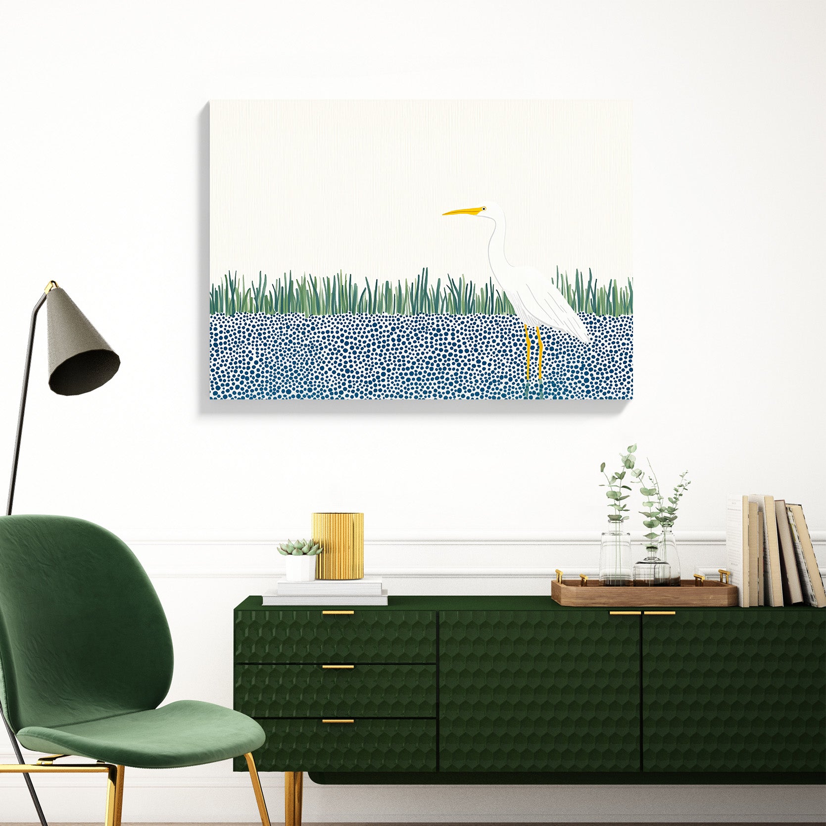 A sleek, modern, and highly stylized illustration featuring a majestic white Great Egret or Heron. The bird stands prominently on long, yellow legs, its clean white body contrasting sharply with the abstract background. The lower half of the scene features a bold, graphic pattern of dense blue and white circles (bubbles or dots) representing water. The bird is framed by a minimalist band of bright green vertical reeds and set against a vast, clean white background, emphasizing negative space and modern elegance. This design is perfect for contemporary, minimalist, or coastal decor.