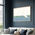 Elegant Minimalist Painting Of A Great White Egret Standing On Stylized Abstract Blue Bubbles And Simple Green Reeds