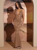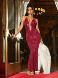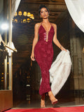 Elegant Night Out: Black Lace Bodycon Maxi Dress with Halter Neckline & Strappy Cutouts