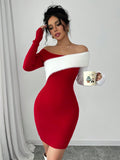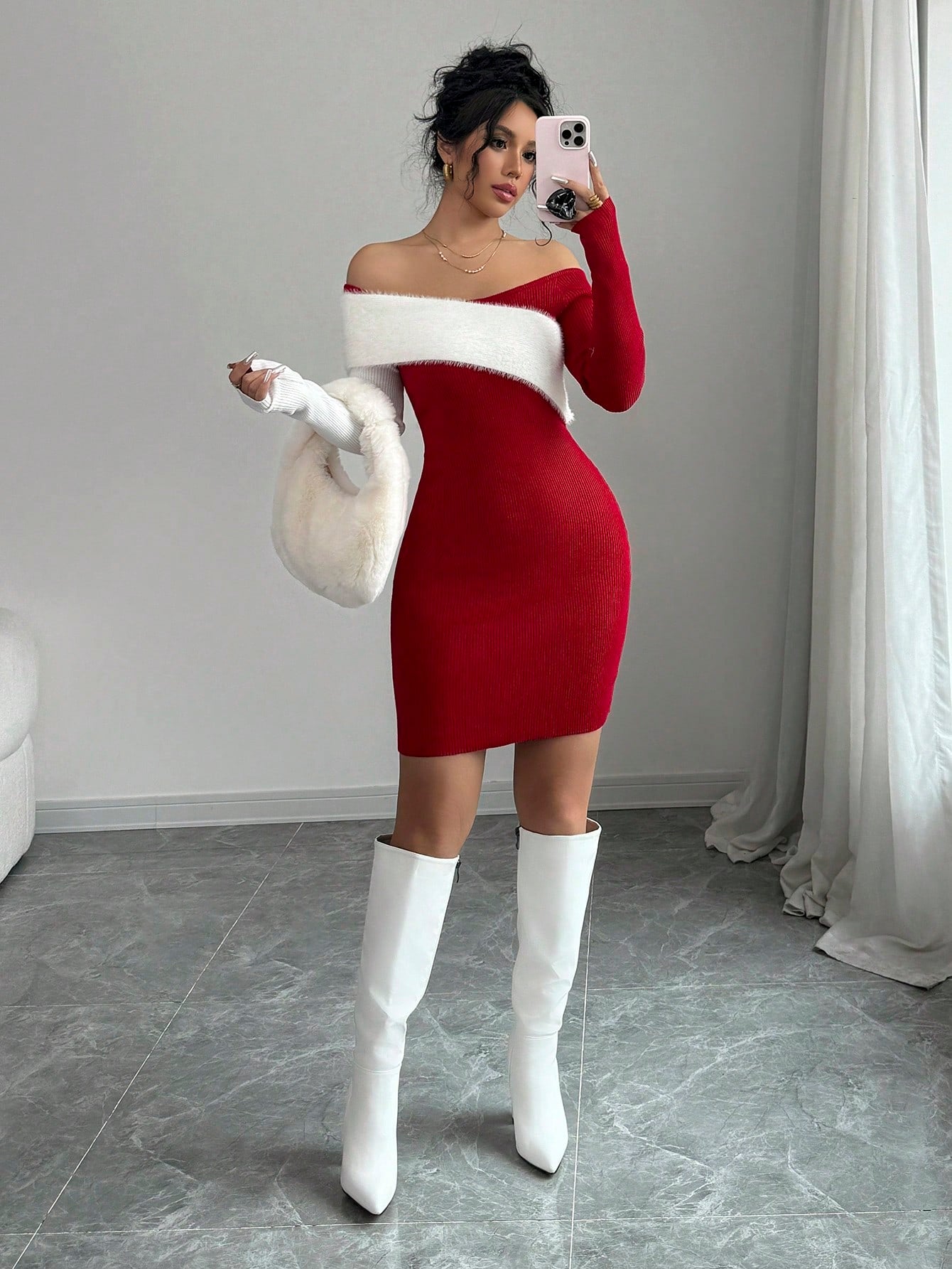 Elegant Off-Shoulder Furry Color Block Sweater Dress for a Chic Christmas Look