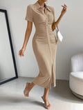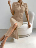 Elegant Pleated Collar Wrap Dress with High Slit for Effortless Style