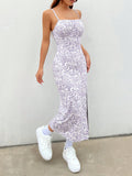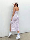 Elegant Porcelain Floral Print Backless Spaghetti Strap Dress with Slit