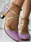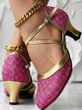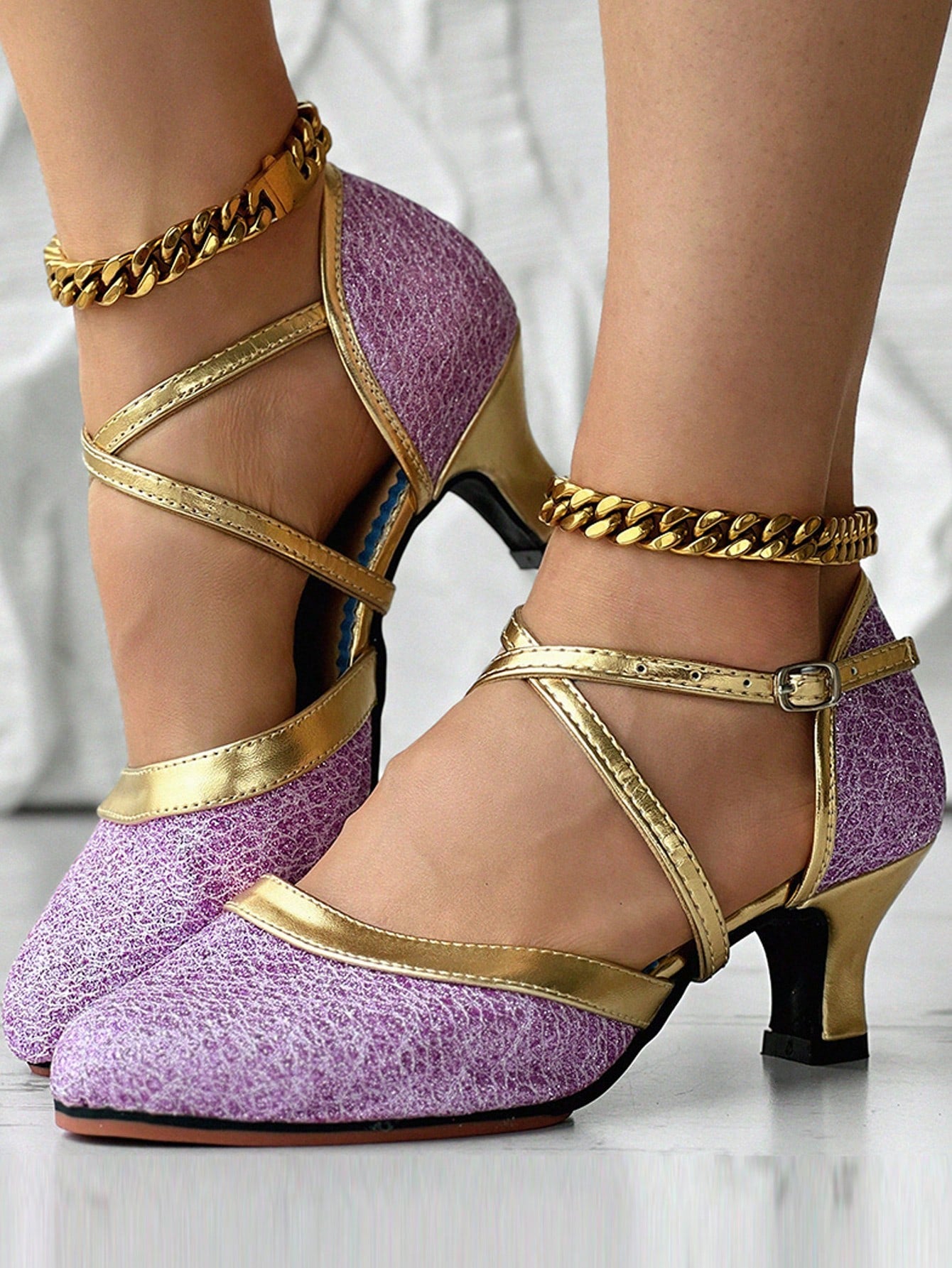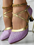 Elegant Purple & Gold Metallic Sequin Latin Dance Shoes with Chunky Mid Heel