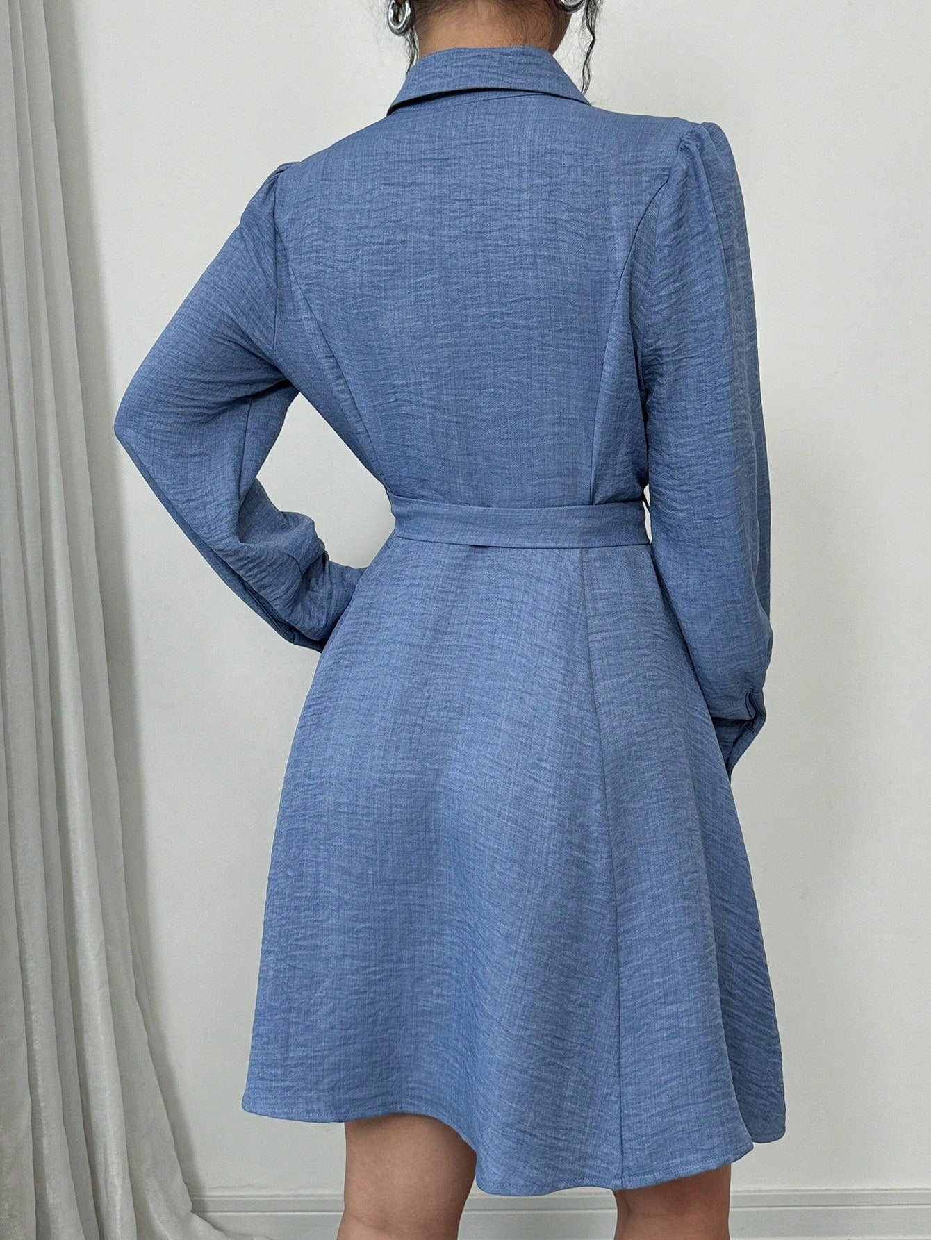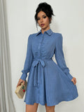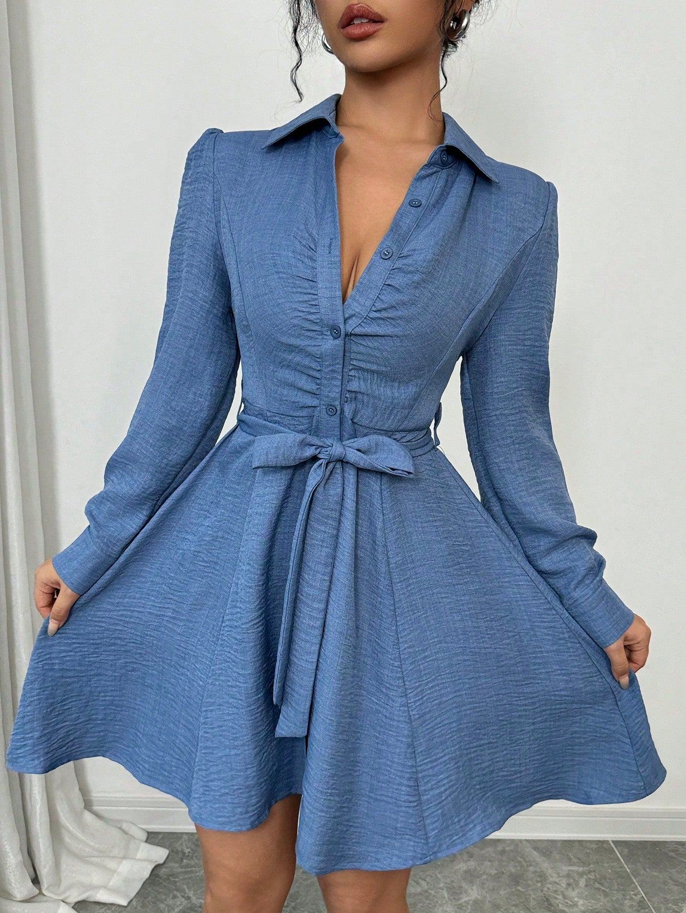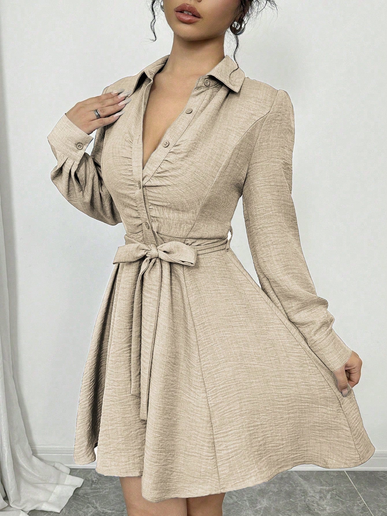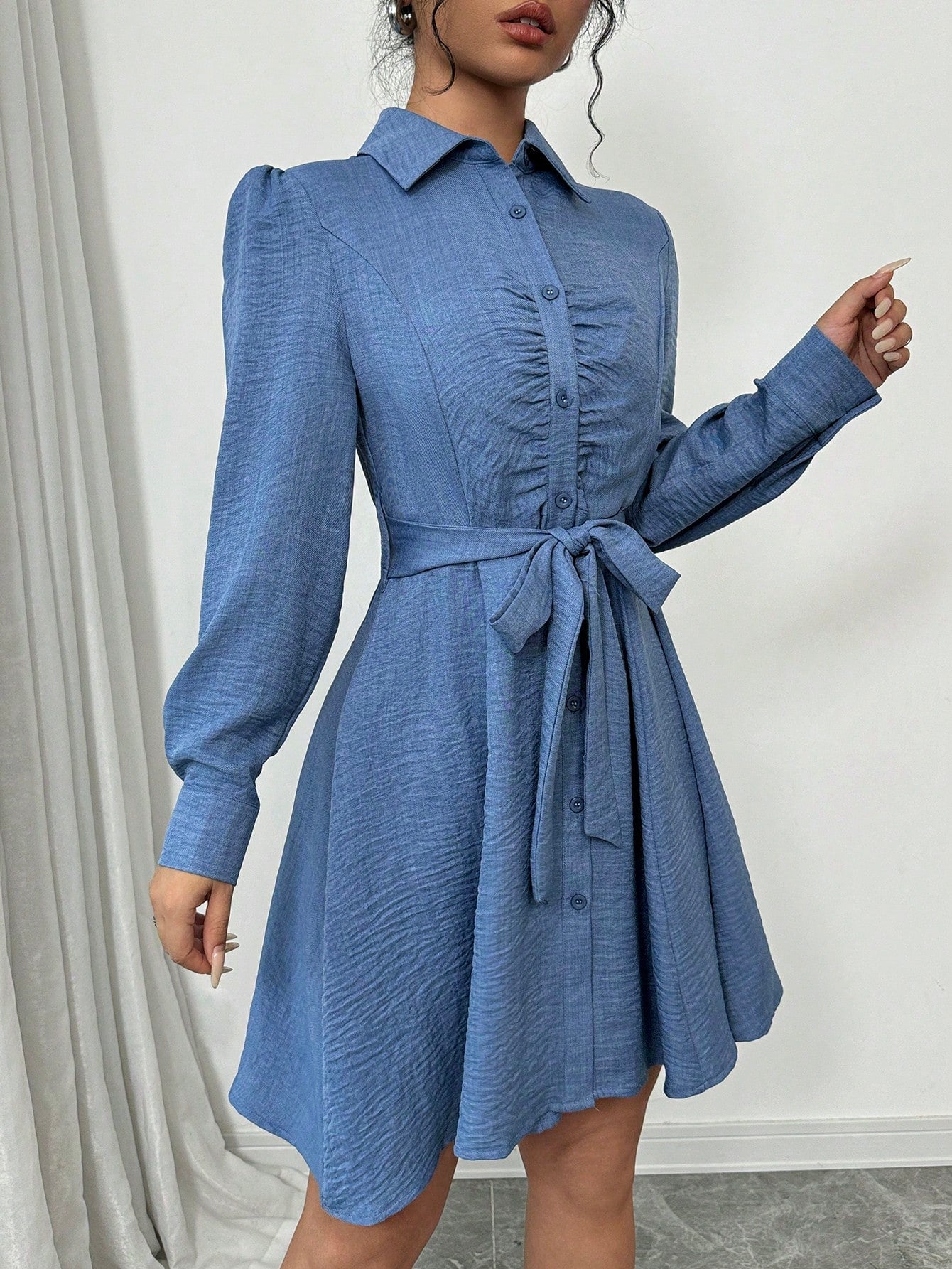 Elegant Ruched Waist Long Sleeve Dress with Front Buttons