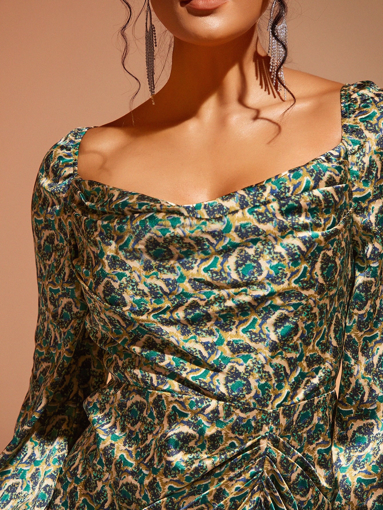 Elegant Satin Draped Collar Ruched Dress with Split Thigh & Tie Back
