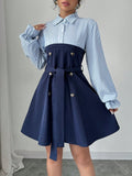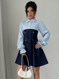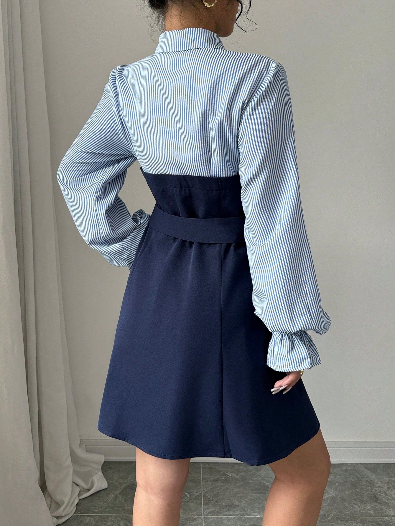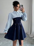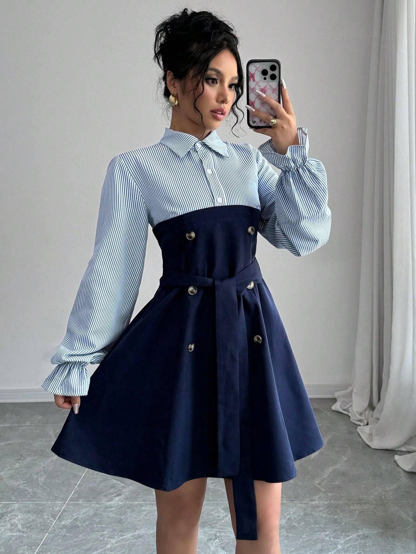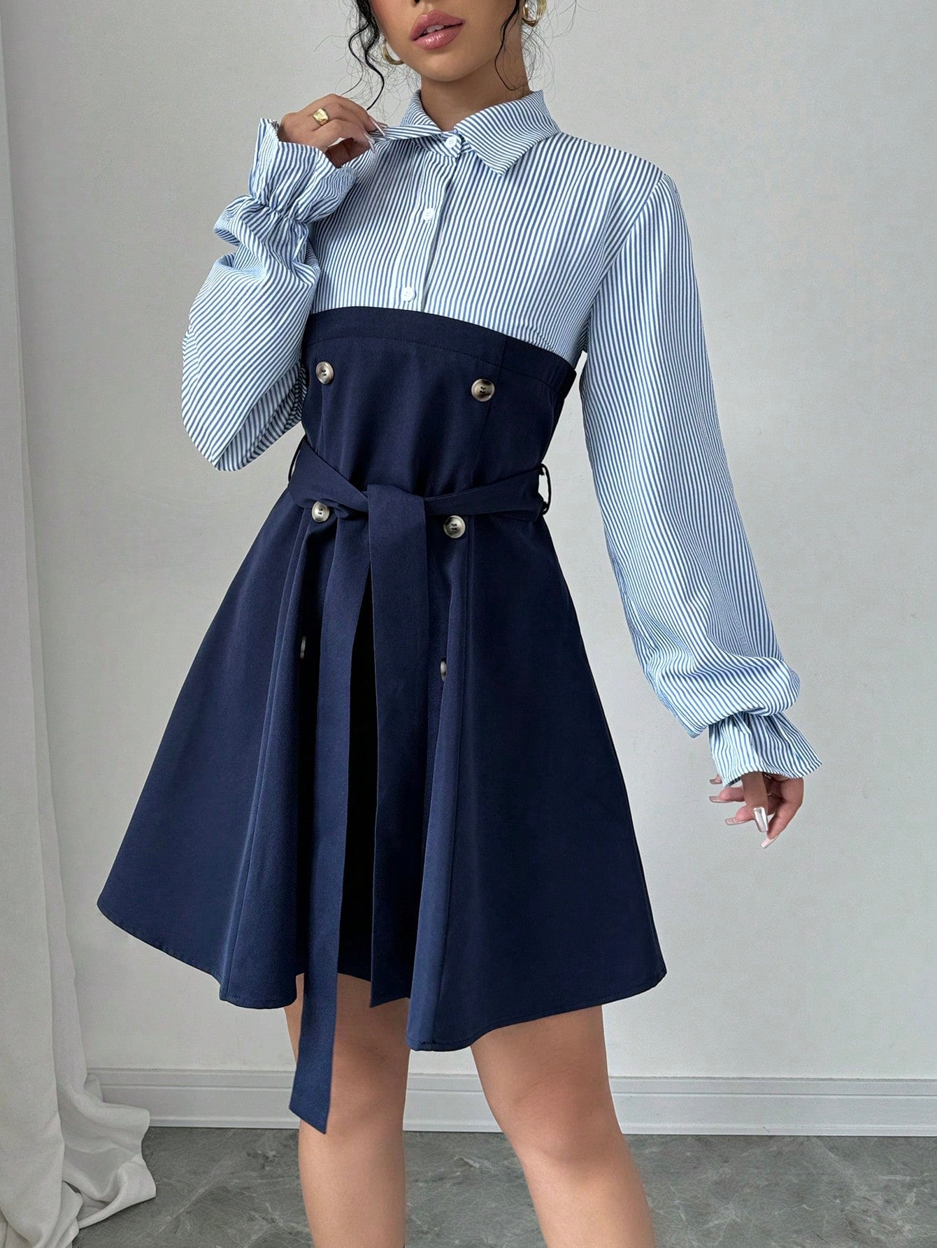 Elegant Striped Patchwork Long Sleeve Dress with Button Placket
