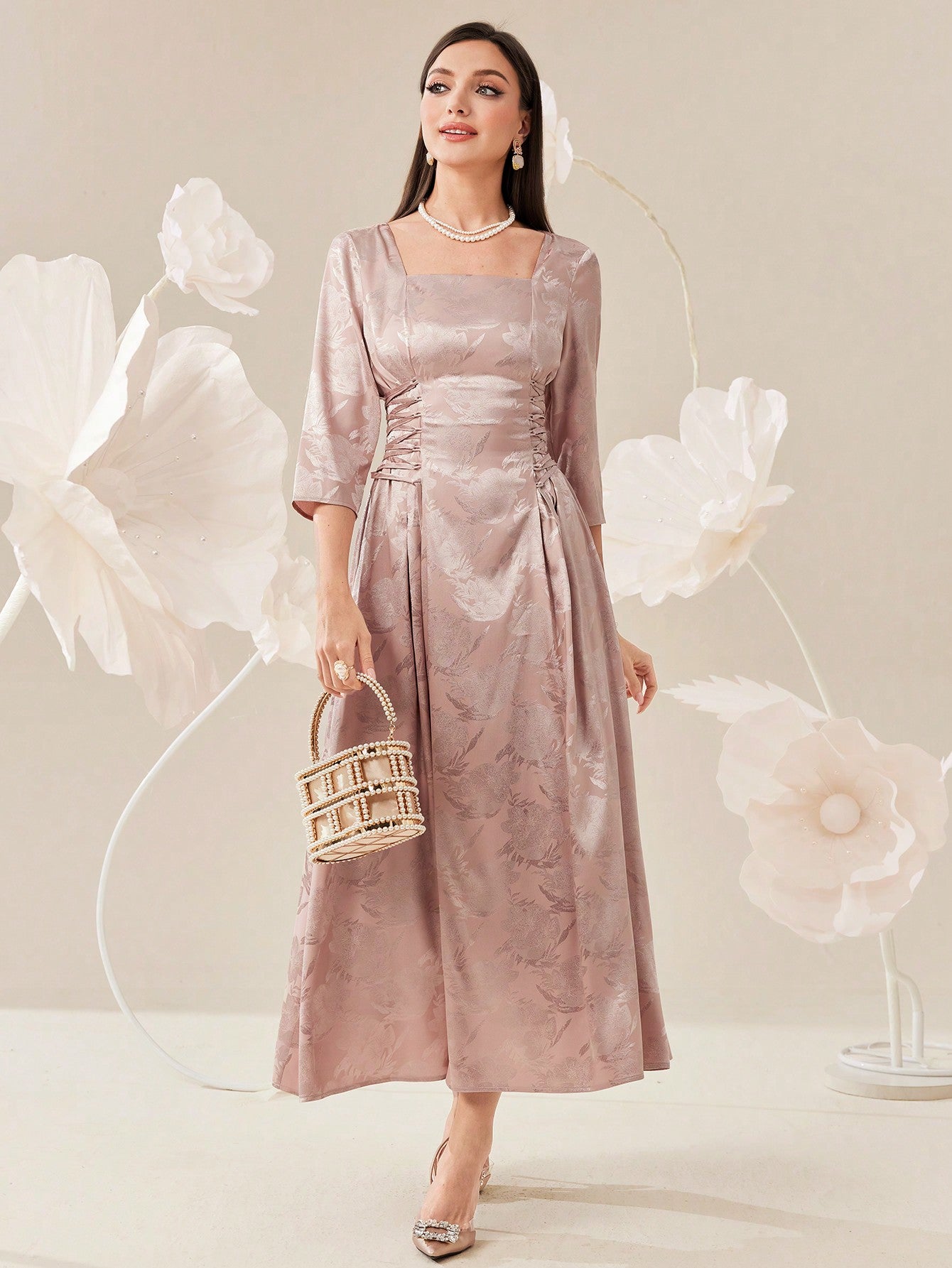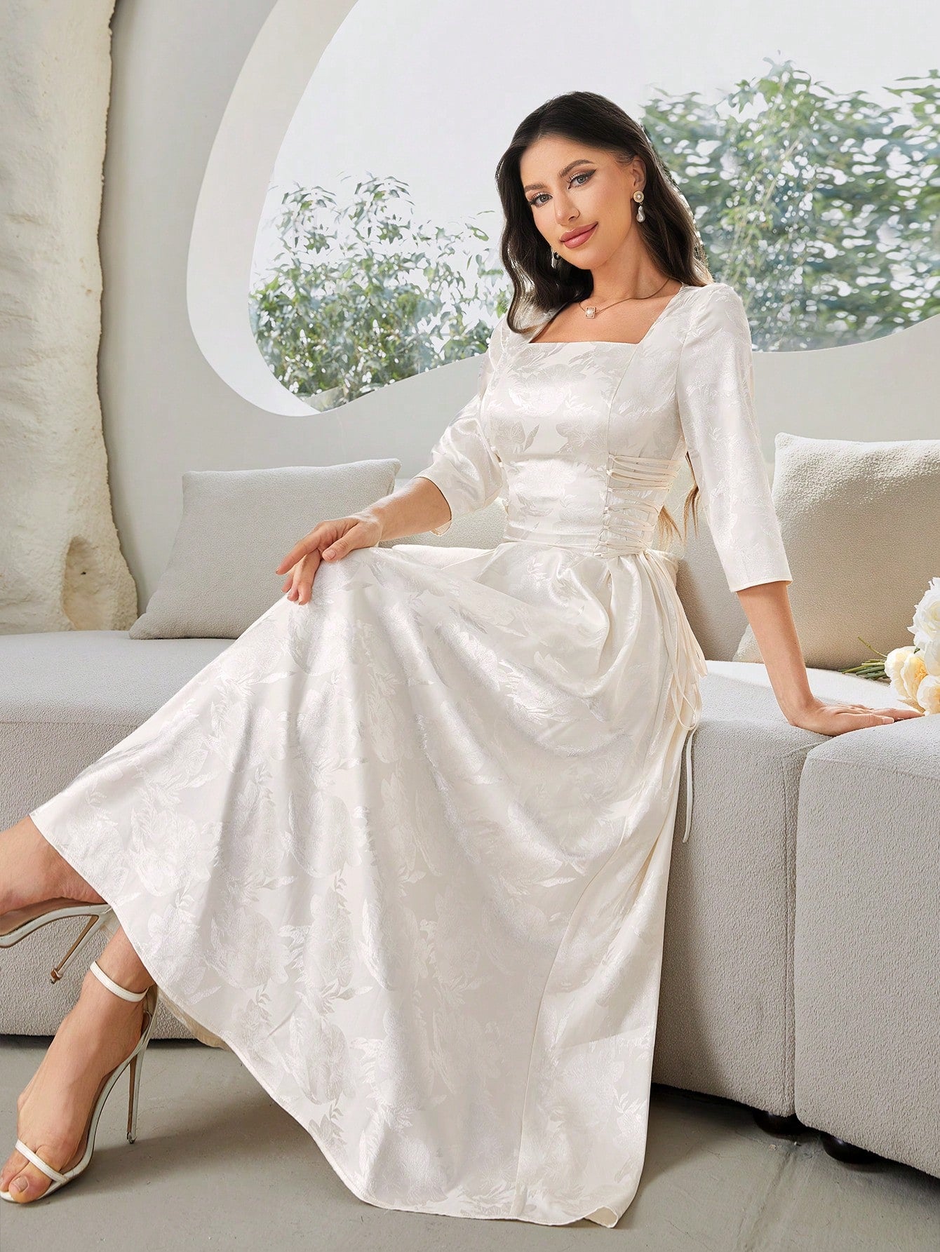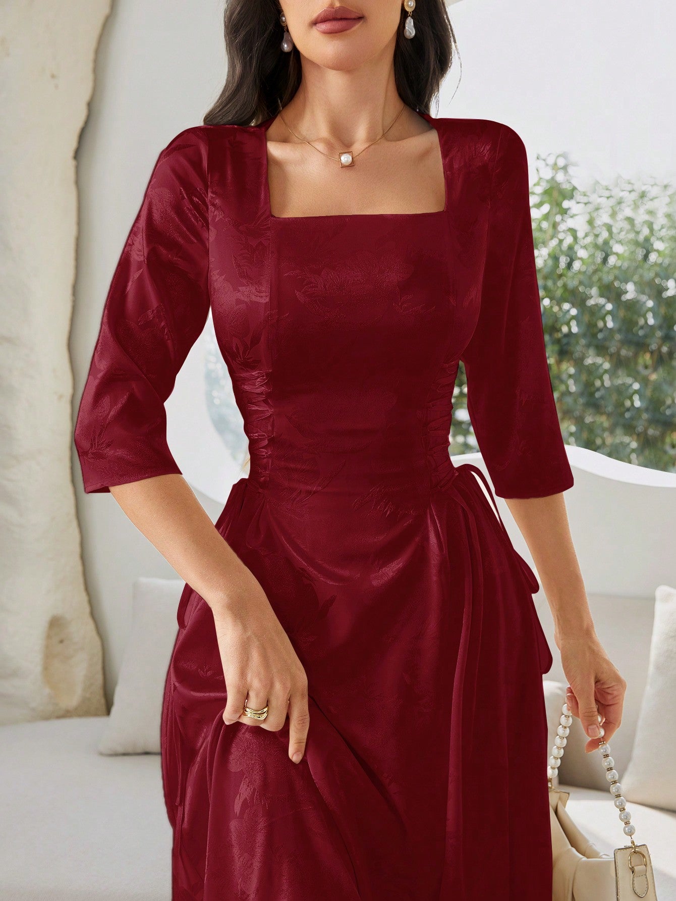 Elegant Summer Jacquard Dress with Cross Strap and Cinched Waist