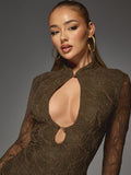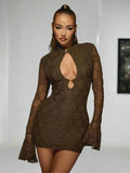 Elegant Textured Sheer Cut-Out High Neck Bodycon Mini Dress with Bell Sleeves