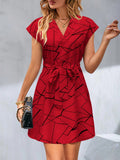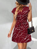 Elegant V-Neck Short Sleeve Dress with Allover Text Print and Waist Tie