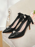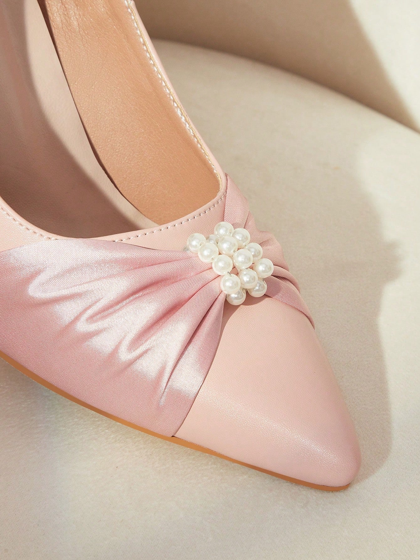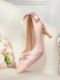 Elegant White Satin High Heel Pumps with Faux Pearl Button Bow Detail