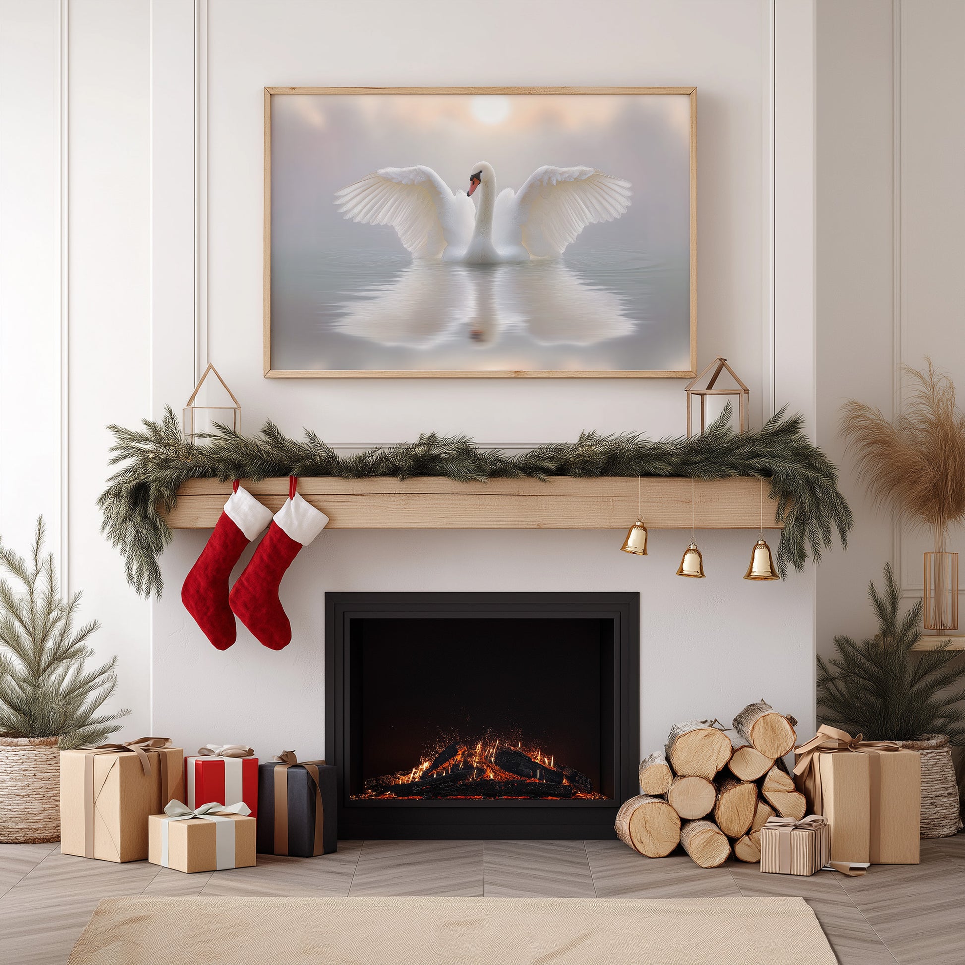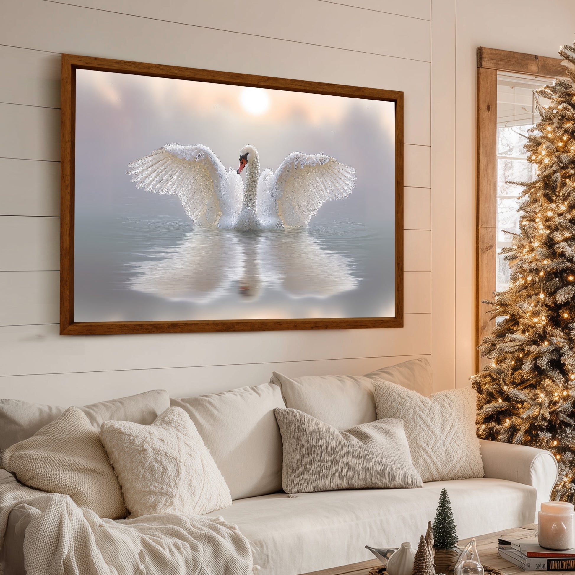A serene and ethereal digital painting of a majestic white swan gliding on still water with its wings gracefully spread. The scene features a soft, misty background with a gentle sun glowing through the haze, creating a perfect reflection on the water's surface. This peaceful artwork is ideal for creating a calming atmosphere in a bedroom, spa, or modern living room, symbolizing grace and tranquility.