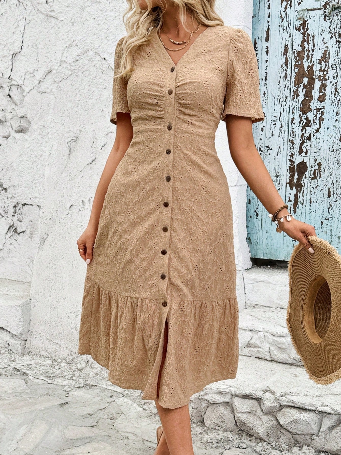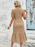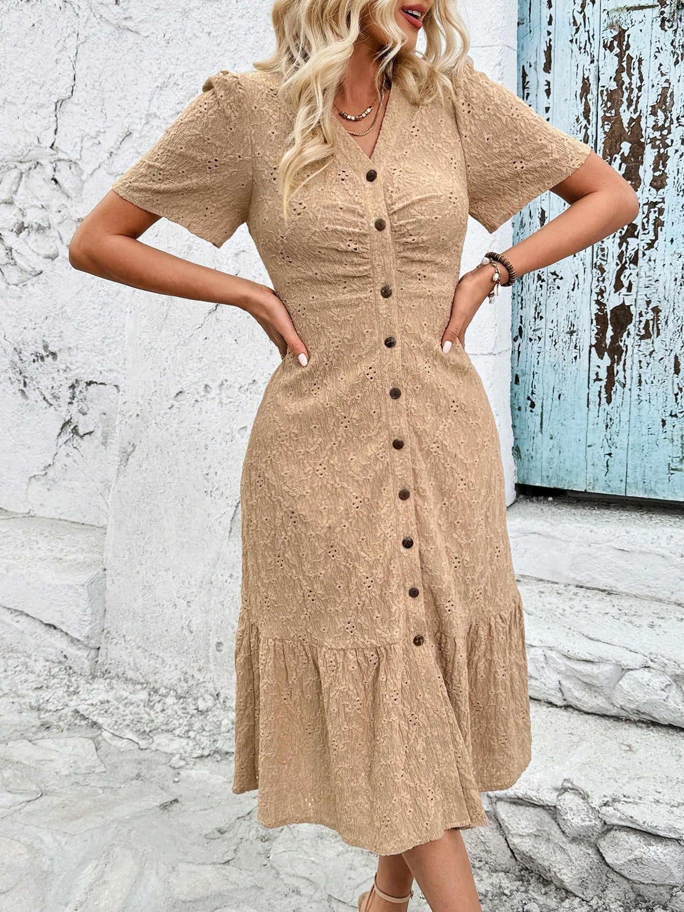 Elegantly Embroidered Ruffle Hem Dress with Chic Hollow-Out Design