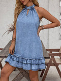 Elevate Your Denim Collection with Keyhole Neckline Ruffle Hem Dress
