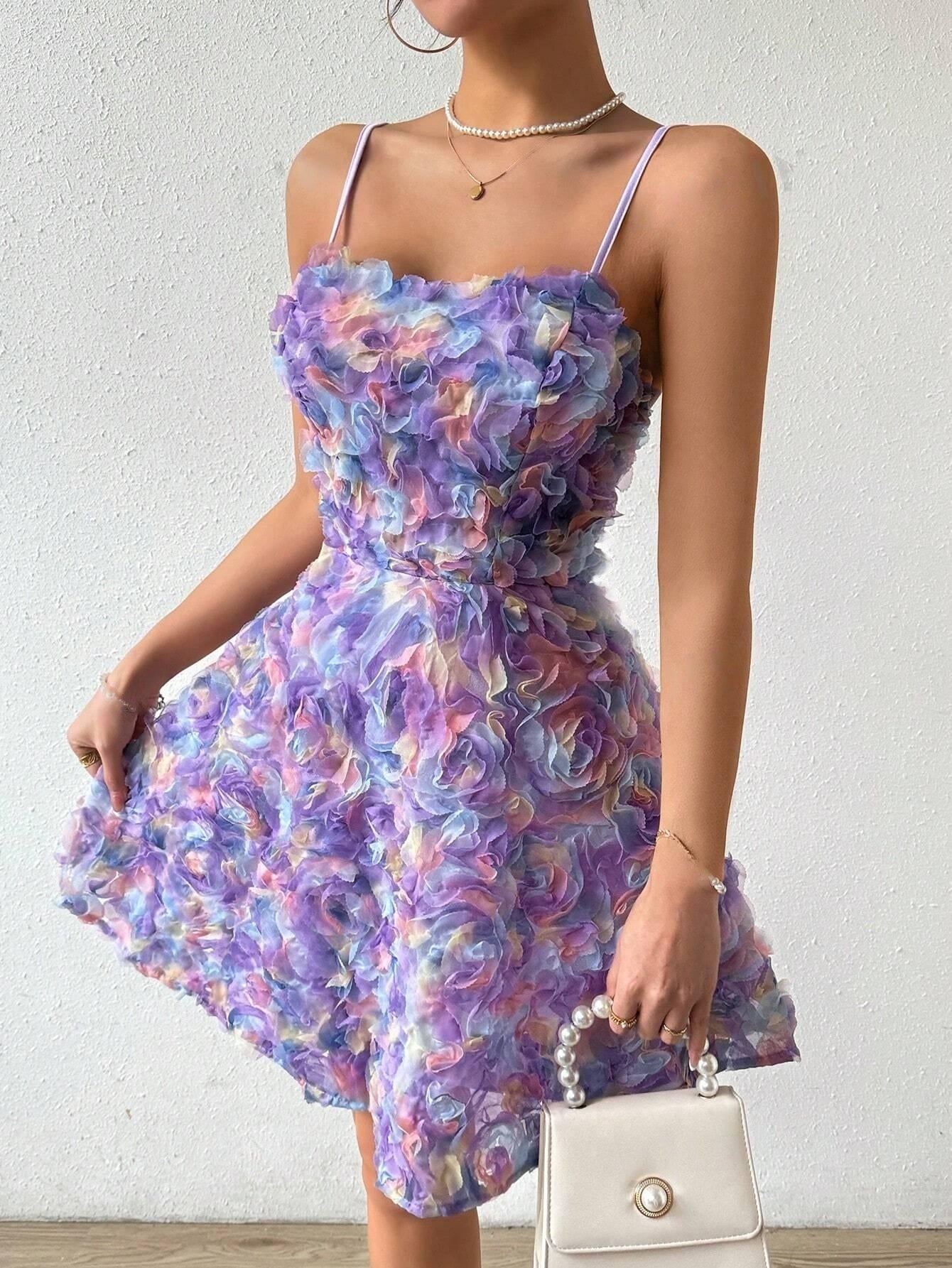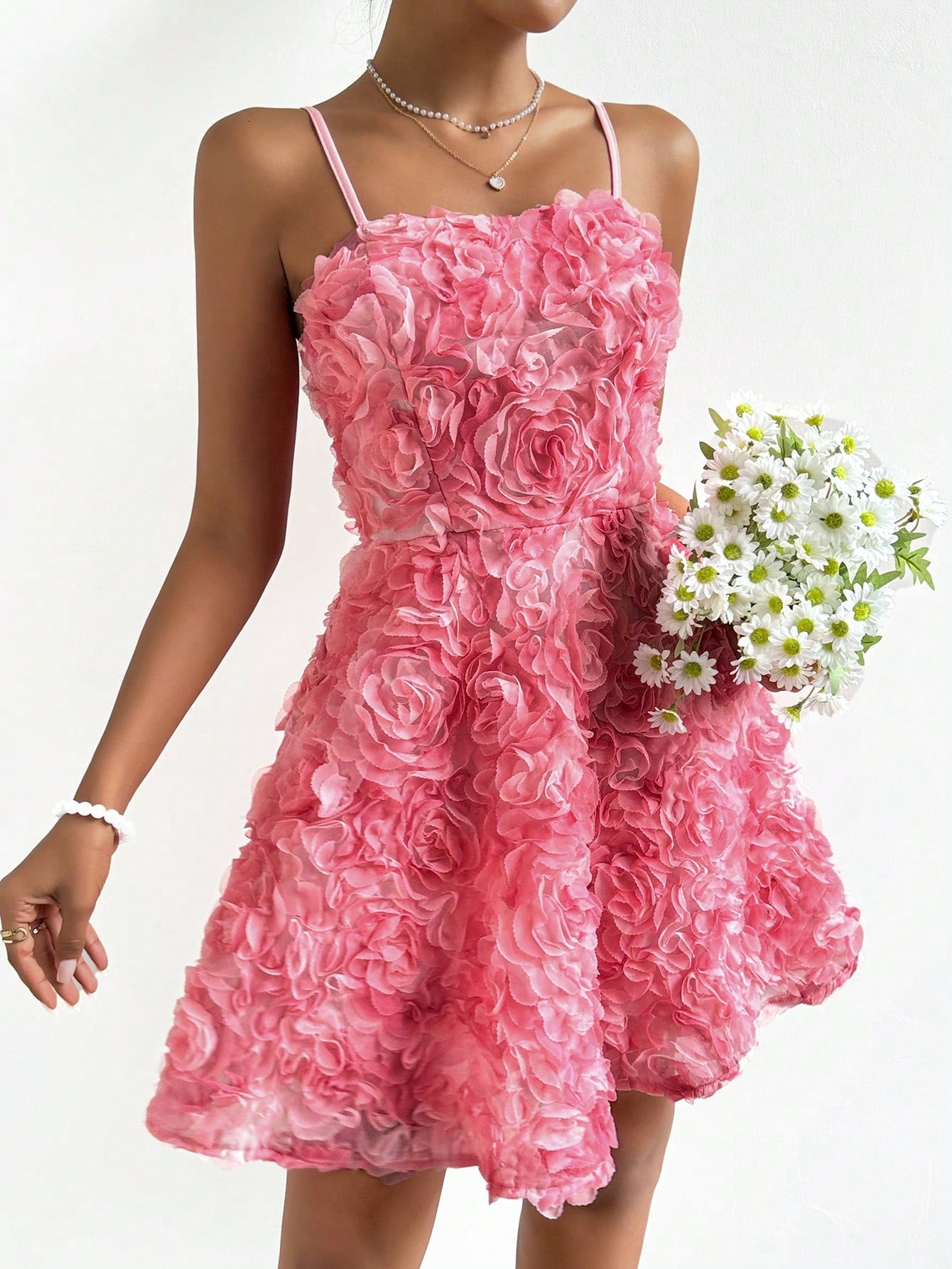 Enchanted Garden Spaghetti Strap Dress: Embellished with 3D Flower Decor
