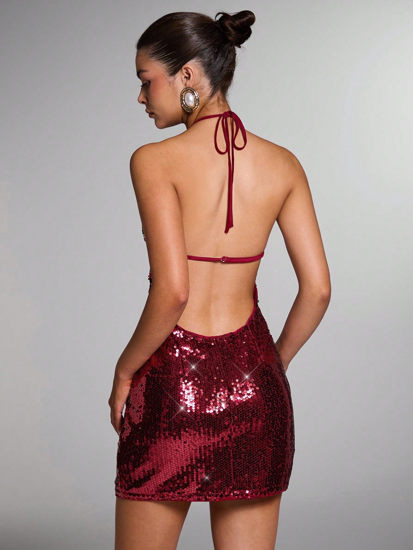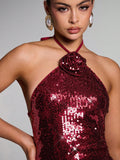Embrace the enchantment of the holiday season with our stunning burgundy sequined dress, adorned with 3D floral accents. Perfect for Christmas parties and special occasions, this dress will make you stand out from the crowd and dazzle all those around you. Be the belle of the ball in this magical dress!