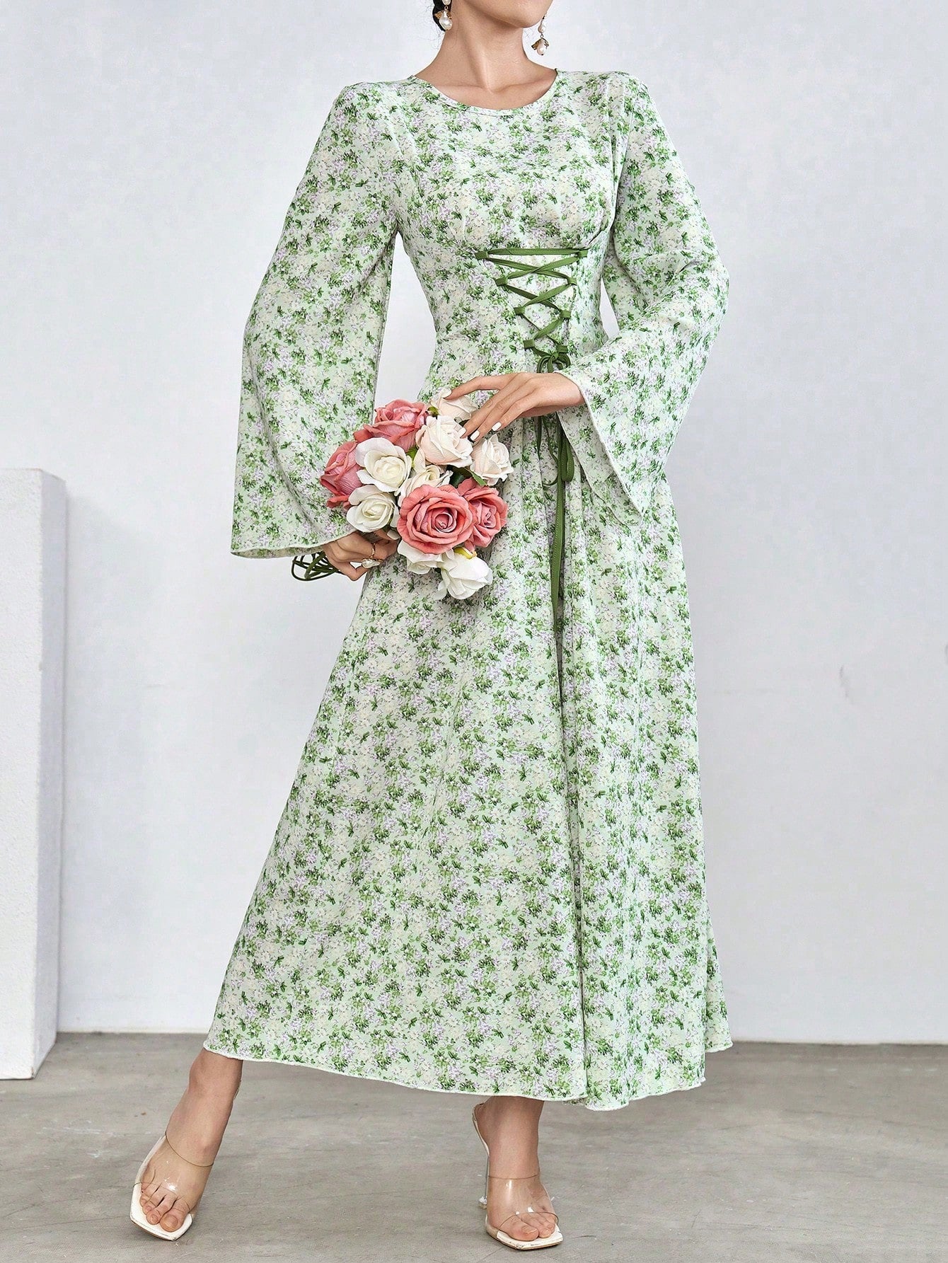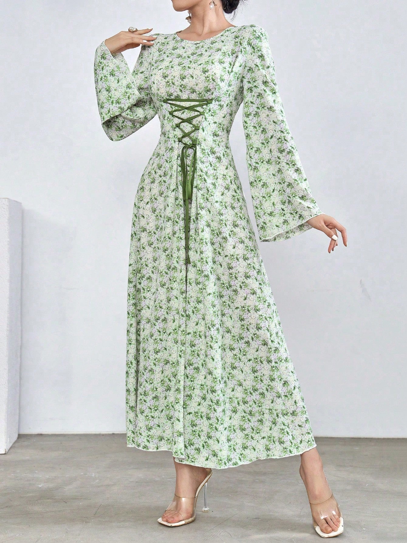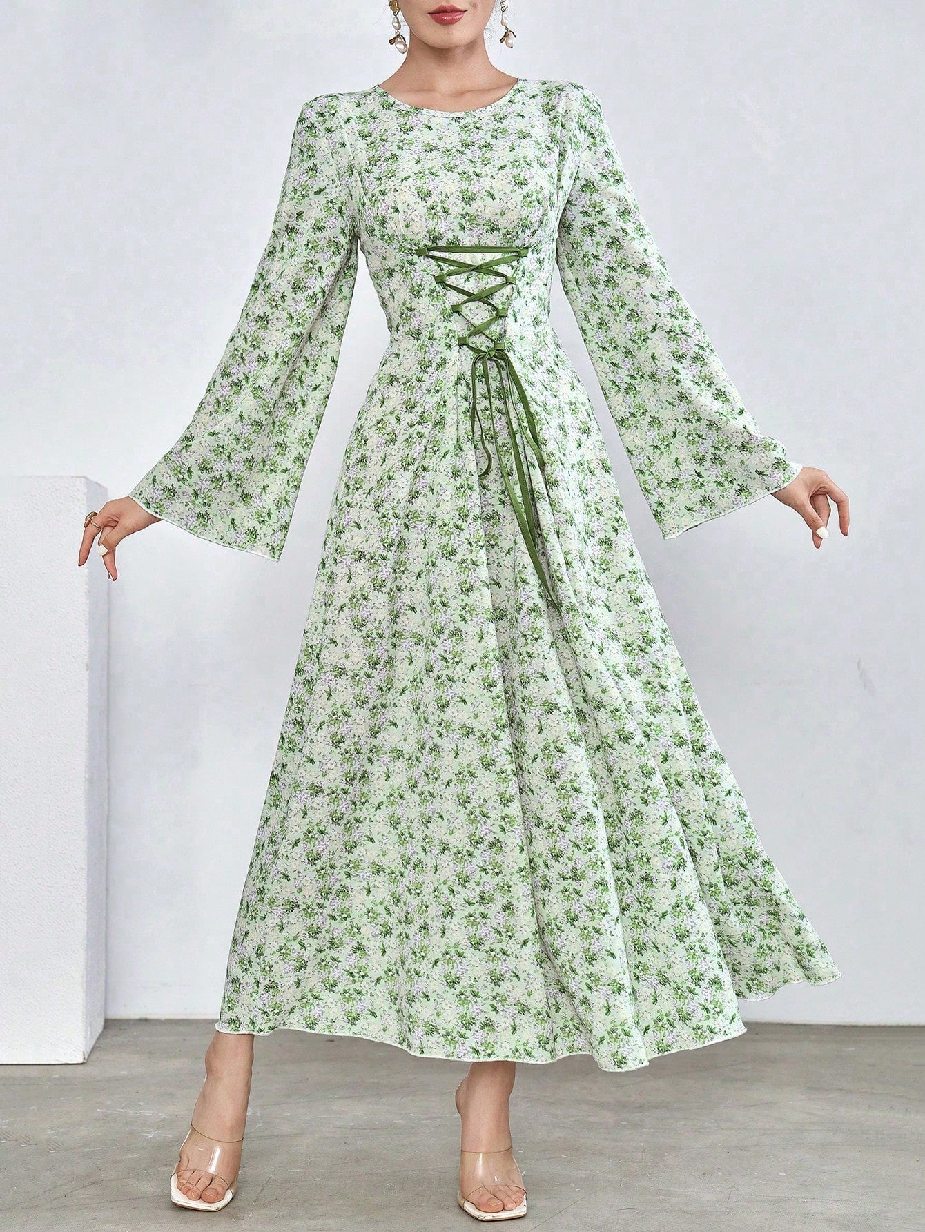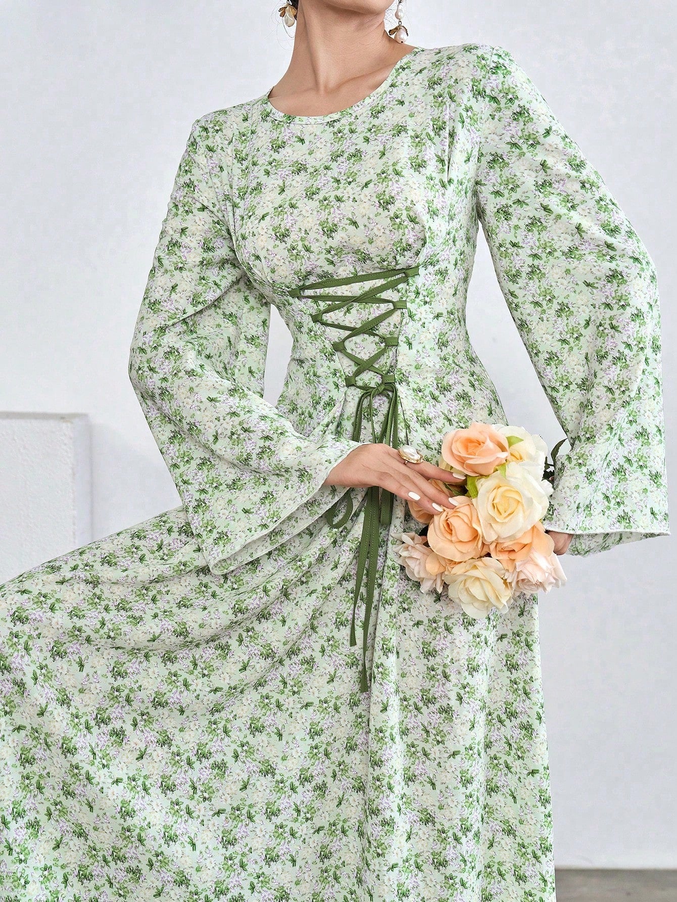 Enchanting Ditsy Floral Lace-Up Arabian Dress for Effortless Elegance